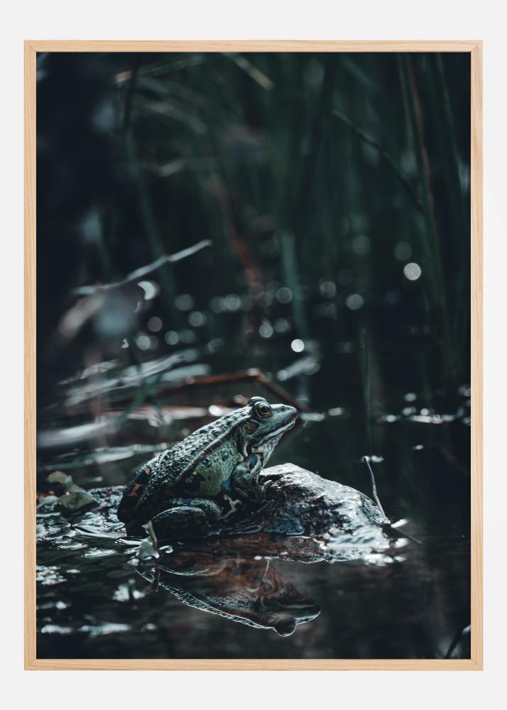 Тази невероятна постер улавя есенцията на спокоен момент в природата, където една самотна жаба е изобразена седяща на камък посред тъмно и мистично езеро. Наситените зелени нюанси на жабата подчертават нейната жизненост срещу тъмния, мъглив фон и искрящите светлинни точки на водното огледало. Нейното отражение върху спокойната водна повърхност допринася за дълбока и вдъхновяваща атмосфера.