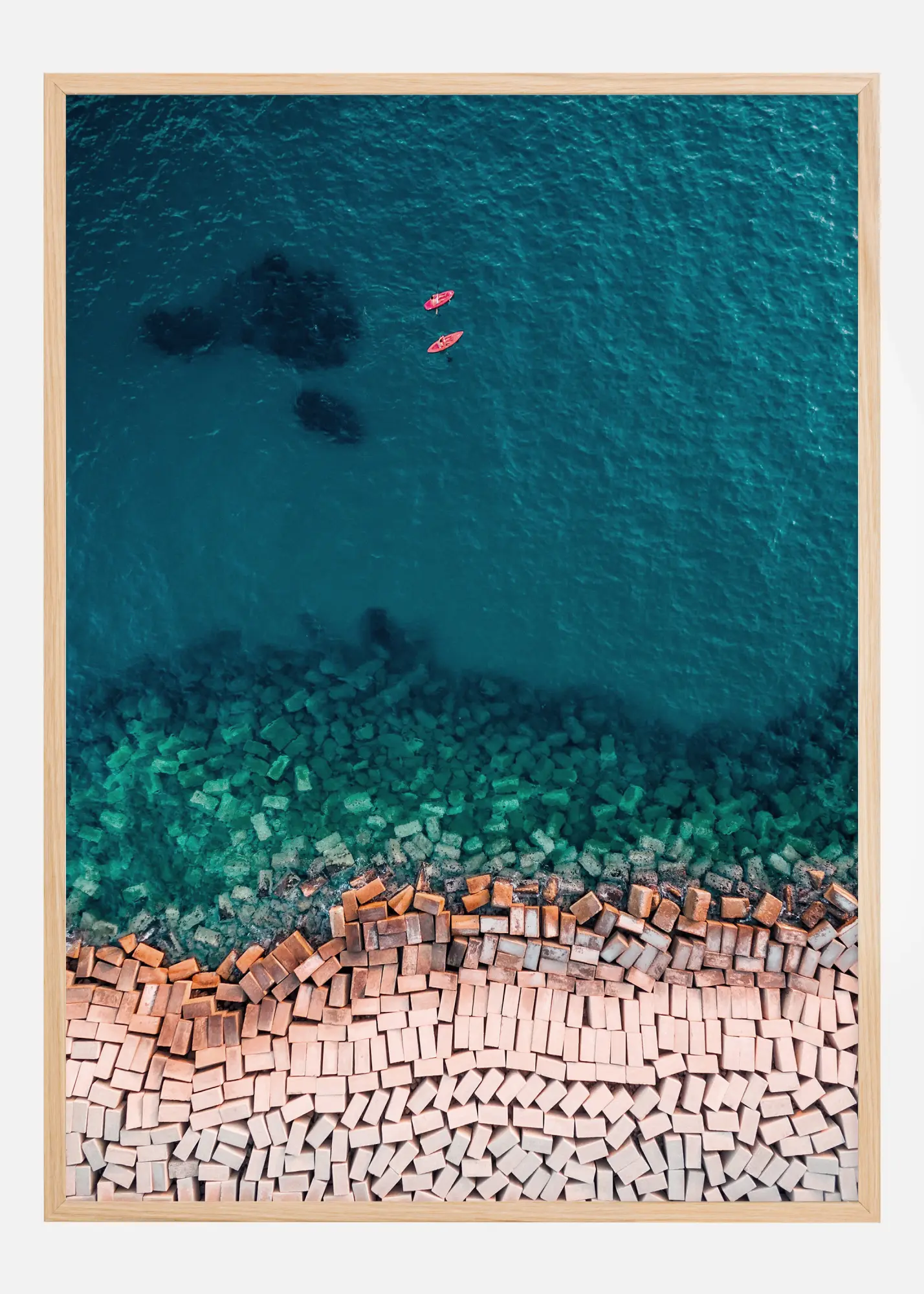 Този постер предлага завладяващ въздушен изглед на каяк, който се плъзга по кристално чиста вода, изобразен срещу скалист бряг. Естествените тонове на синьото и зеленото на морето се сливат с топлите нюанси на камъните по брега. Детайлността на водата и структурата на камъните създават силно усещане за място и среда.