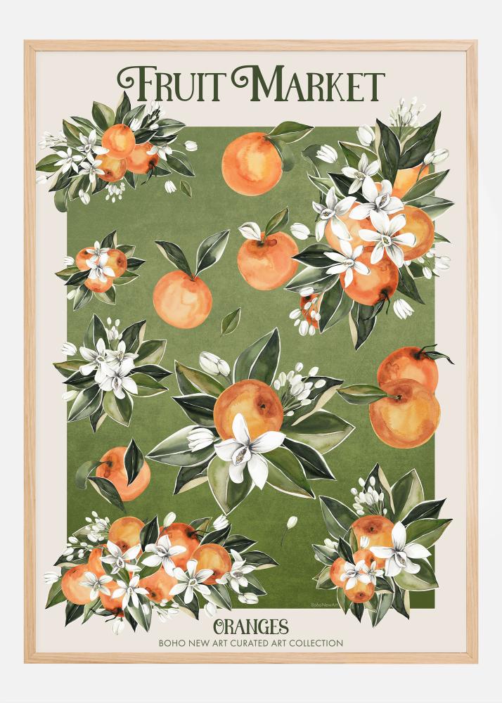 Фонът в дълбок маслиново зелен цвят допълва жизнените оранжеви тонове на плодовете и меките бели на цветни листенца, придавайки на дизайна усещане за свежест и естественост. Постерът принадлежи към 'Boho New Art Curated Art Collection' и е стилна интериорна детайлност, която идеално пасва в кухня или трапезария, където може да вдъхнови към кулинарни приключения или просто да добави усещане за лято през цялата година.