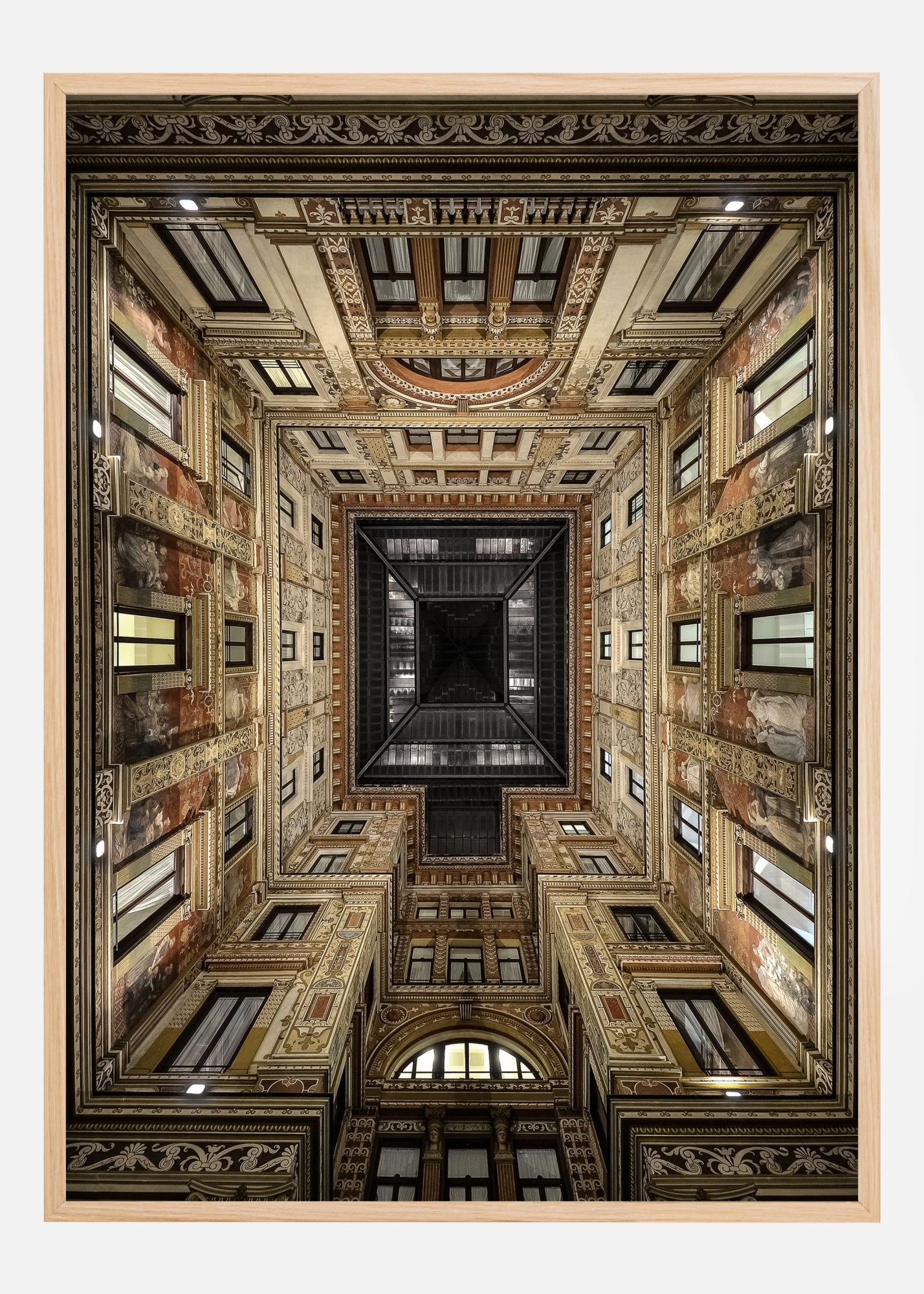 Интериорен постер с Galleria Sciarra и нейната невероятна архитектура. Представете си, че сте в сградата, гледате нагоре към тавана и виждате невероятния избор от прозорци и сложни модели. Вземете това пътуване със себе си у дома.