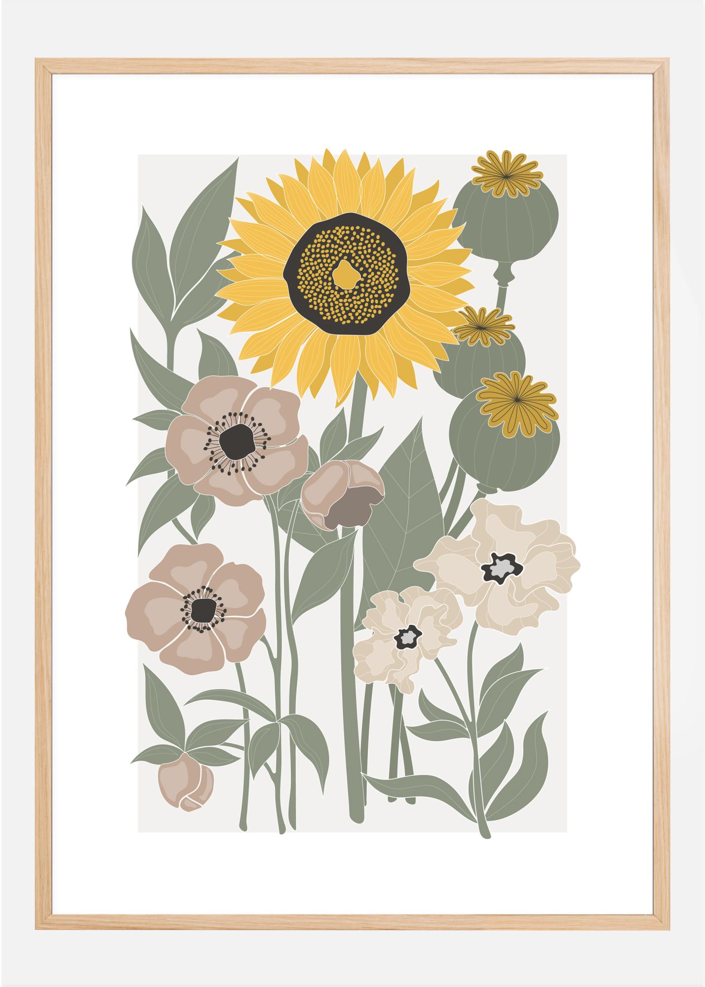 Мек постер с различни цветя. Светъл слънчоглед доминира в центъра на изображението заедно с други цветя като мак в този градински постер. Простият стил улеснява виждането на детайлите и насладата на тази слънчева картина.