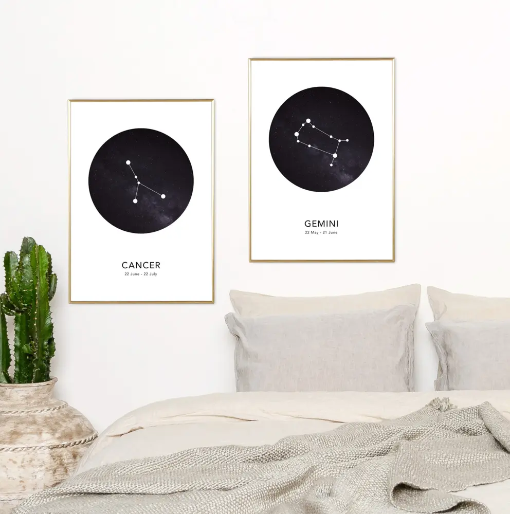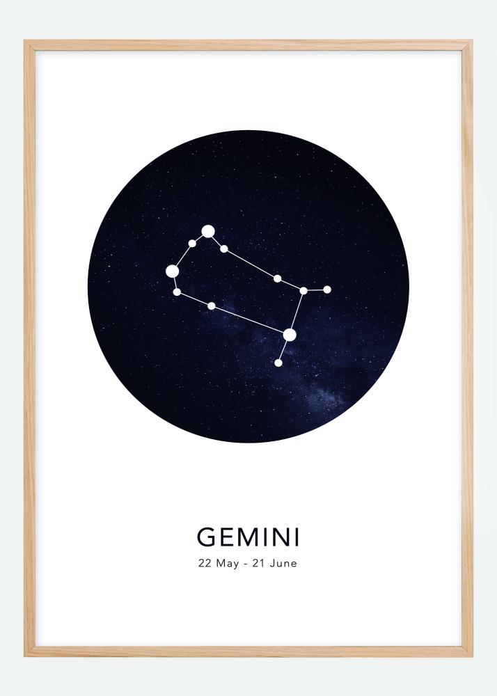 Подарете персонална картина на някого, когото обичате! Тази стилна плакат съдържа изображение на зодиакалния знак Близнаци на фона на черно и синьо звездно небе. Под него е името заедно с актуалните дати на английски.