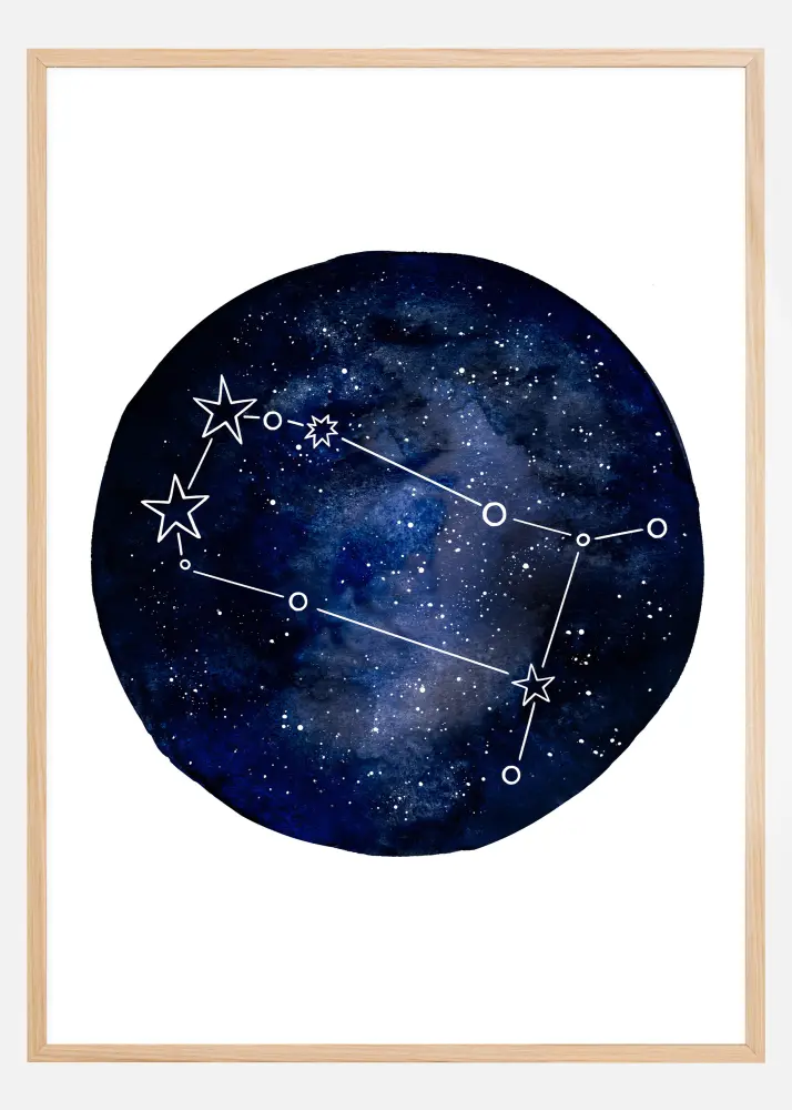 Хороскопски постер с зодиакалния знак Близнаци. Голям тъмносин кръг съдържа редица мигащи звезди. Звездната констелация на Близнаците е ясно скицирана, за да можете да видите своя зодиакален знак. Закачете това, ако сте Близнаци и се гордеете с това.