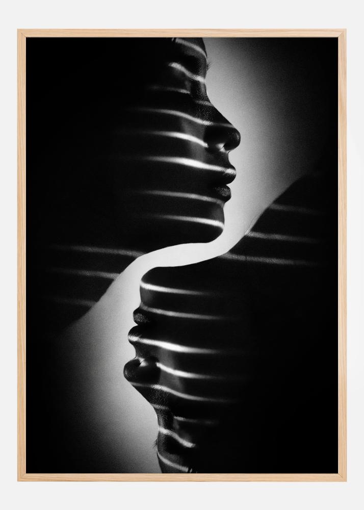 Постер с драматичен двоен портрет на две лица в профил. Ленти от светлина драстично осветяват тези тъмни лица, докато обгръщащата светлина отзад създава ореол. Закачете това на бяла стена, за да увеличите драматичността на този черно-бял принт.