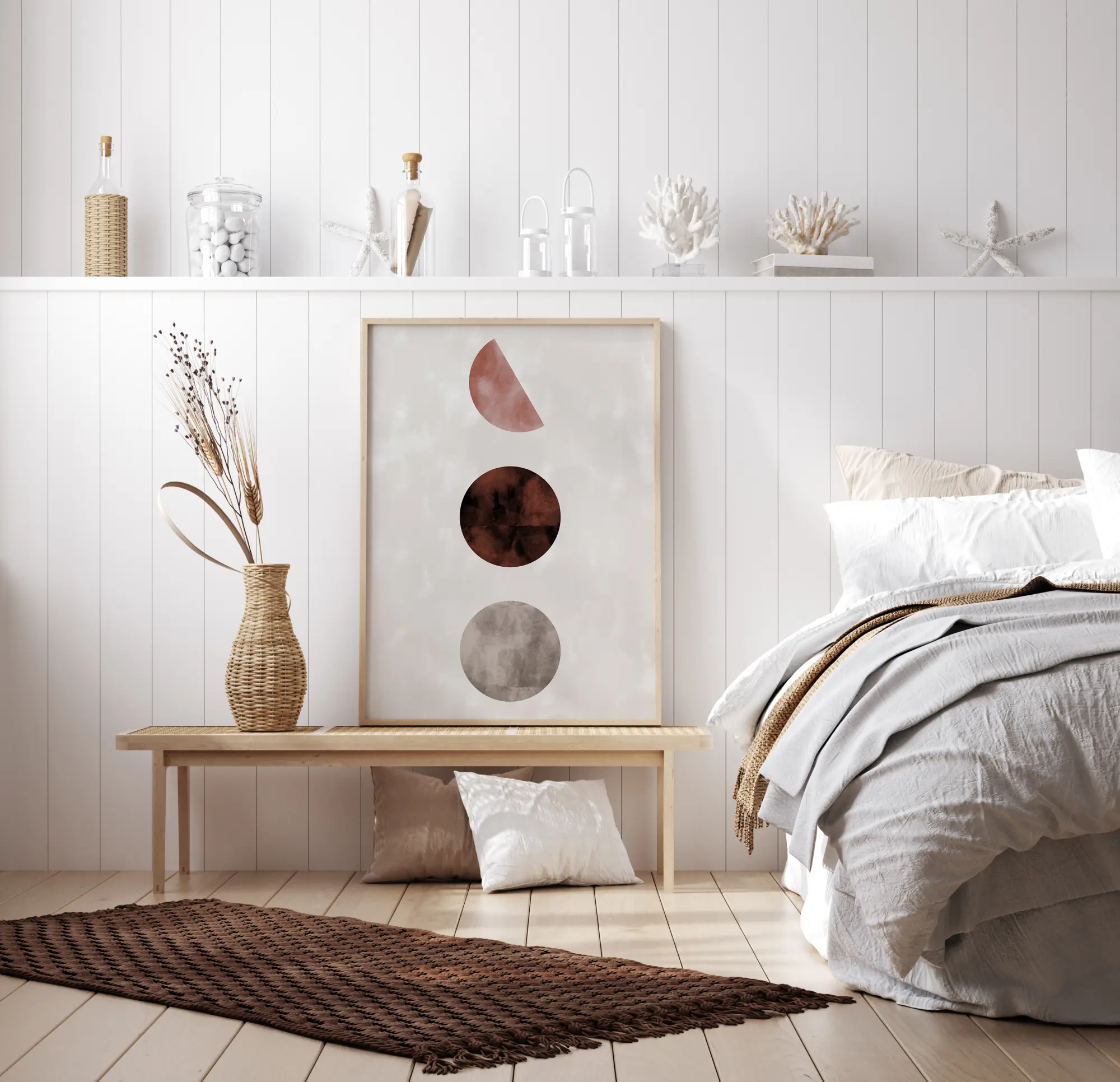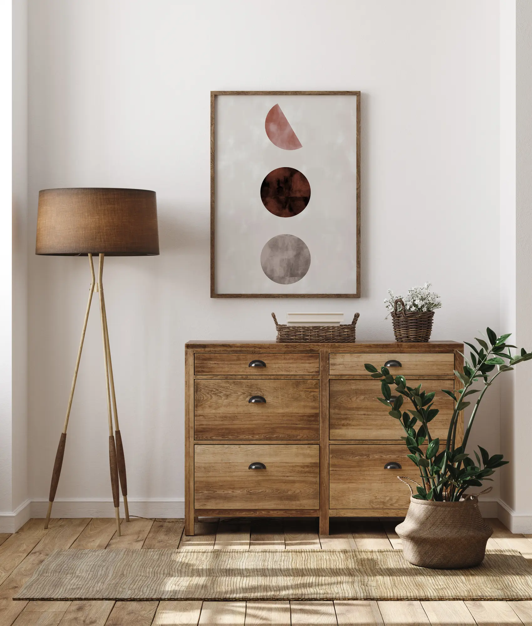 Геометричен постер с два кръга и полукръг на бял фон. Долният кръг е зелен, този в средата е кафяв, а полукръгът отгоре е розов и лежи настрани. Закачете този прост, но привлекателен абстрактен дизайн на обикновена стена, за да придадете усещане за стил и класа.