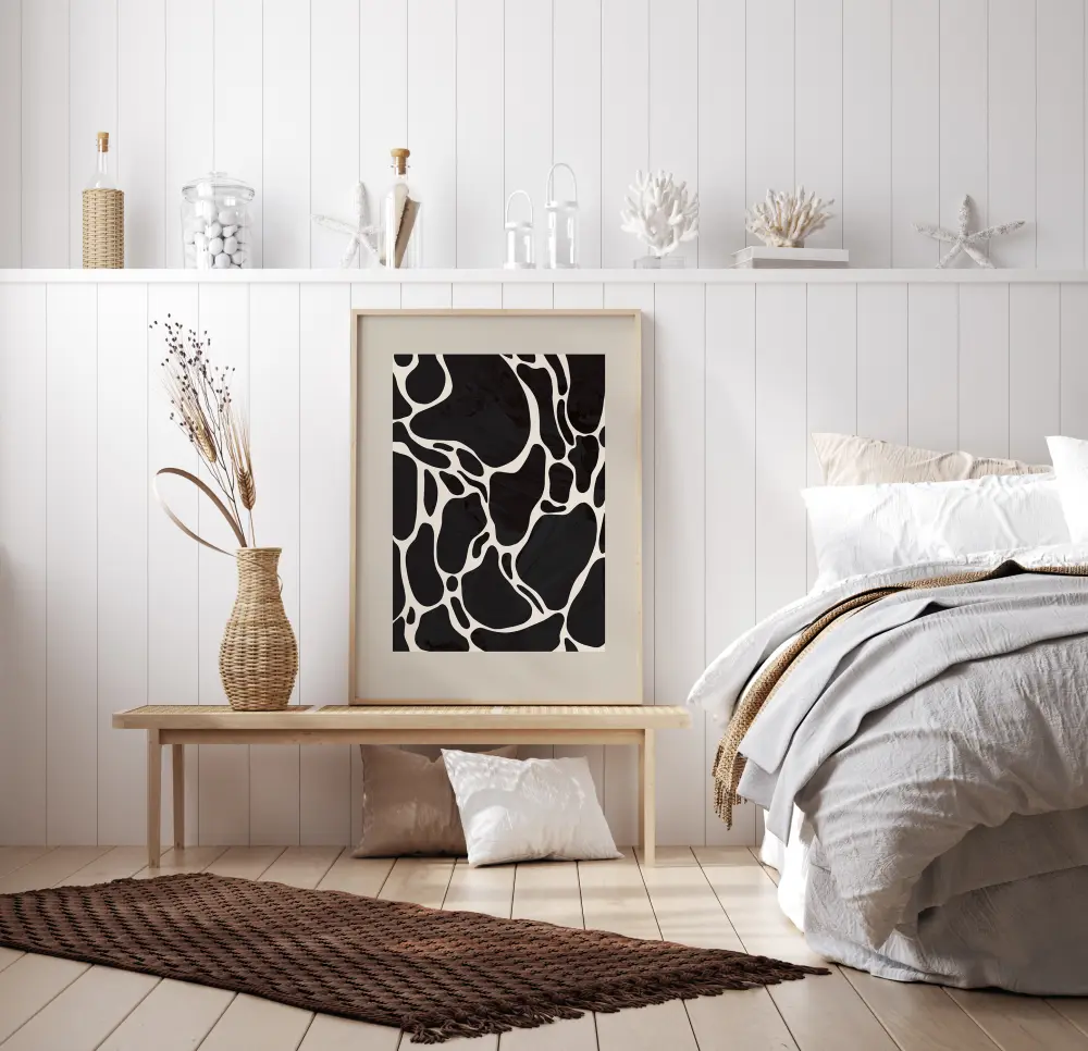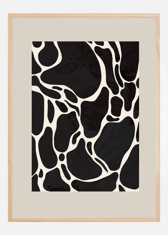 Графичен постер с петна на жираф в черно и бяло. Големите цветови блокове в черно създават привлекателна картина, докато четковите щрихи в тях придават допълнителна текстура. Дебелите бели линии прекъсват петната на жирафа и създават движение и поток в изображението.