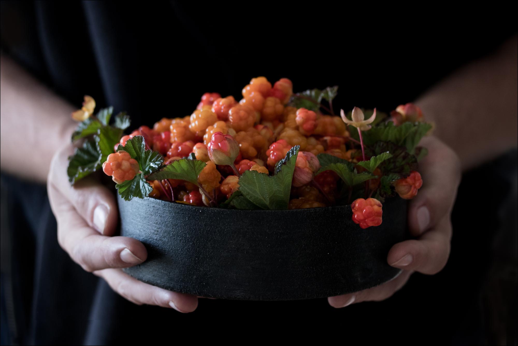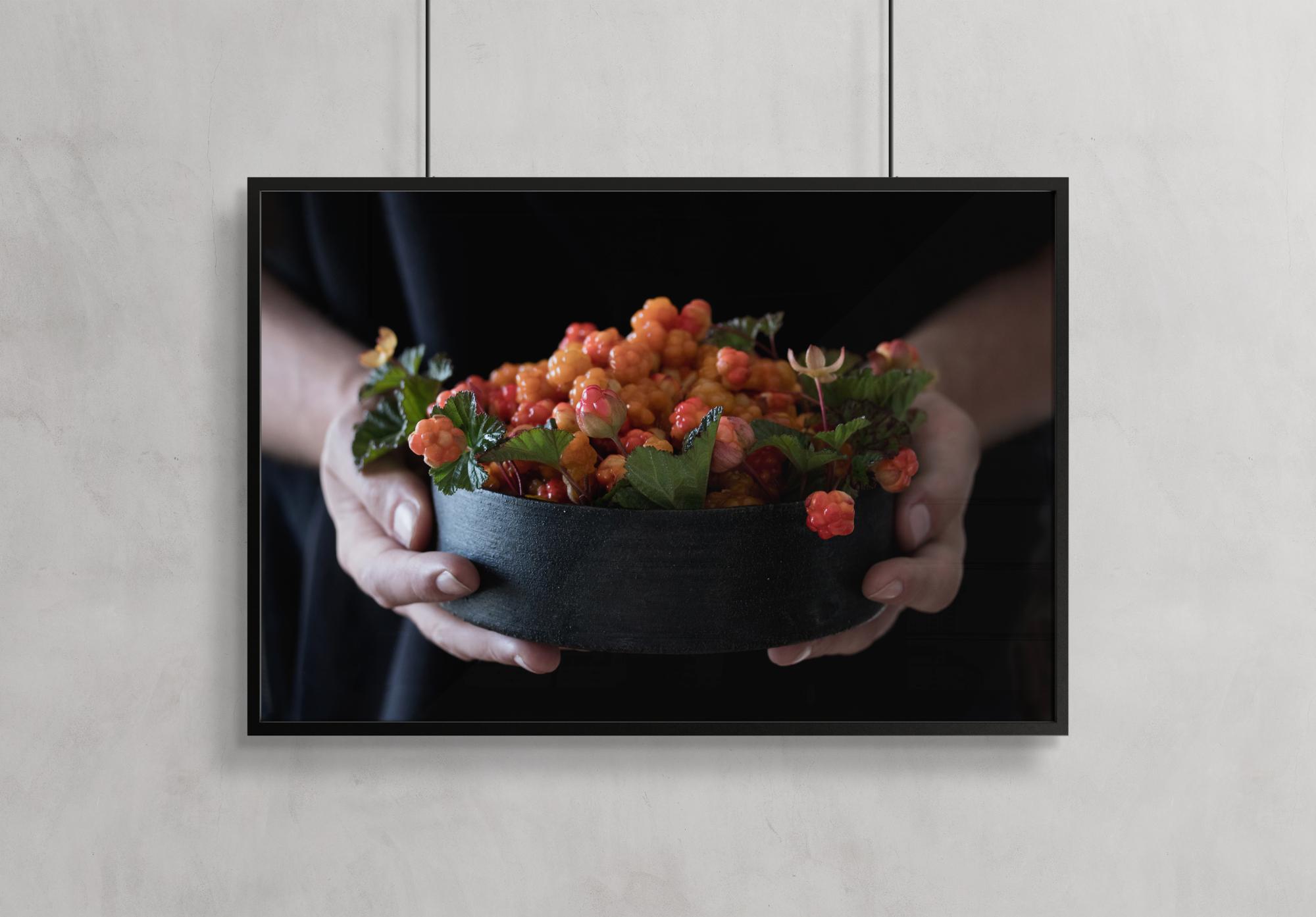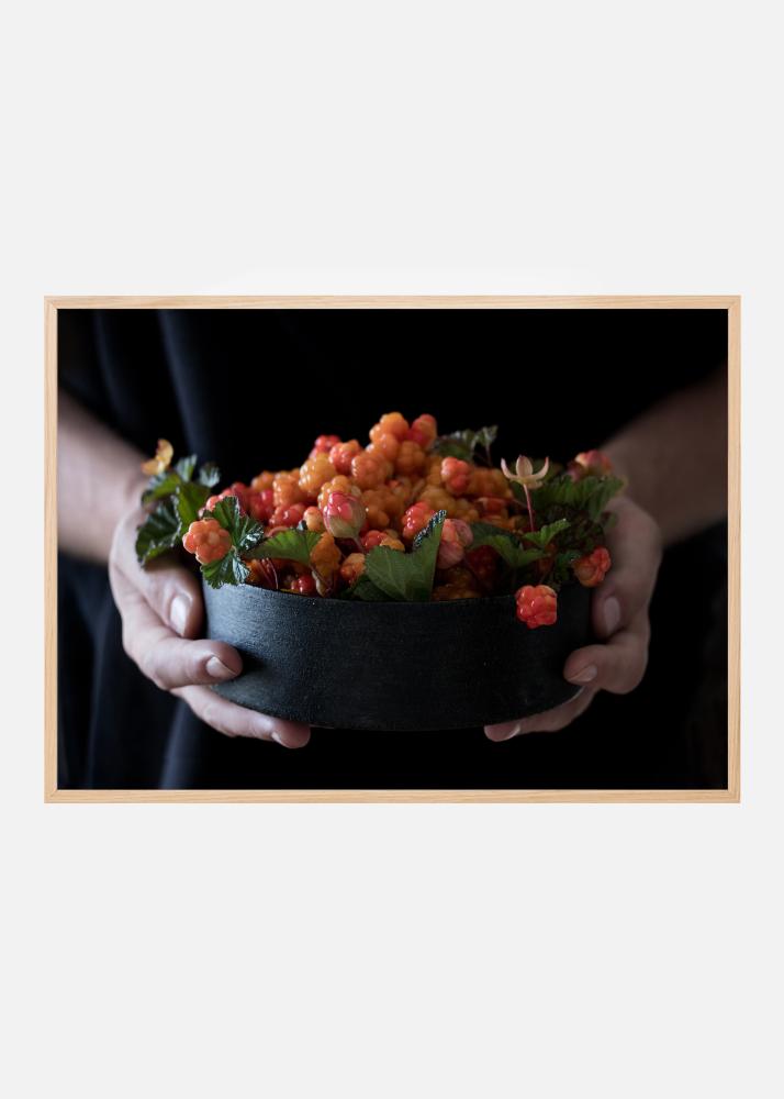 Плакат с плодове с позлатени плодове, които лежат в купа, държана от две ръце. Тази свежа фотография показва позлатените плодове и листа в обикновена черна купа. Две ръце я държат и предлагат, сякаш се готвят да ви я предадат точно тук и сега.