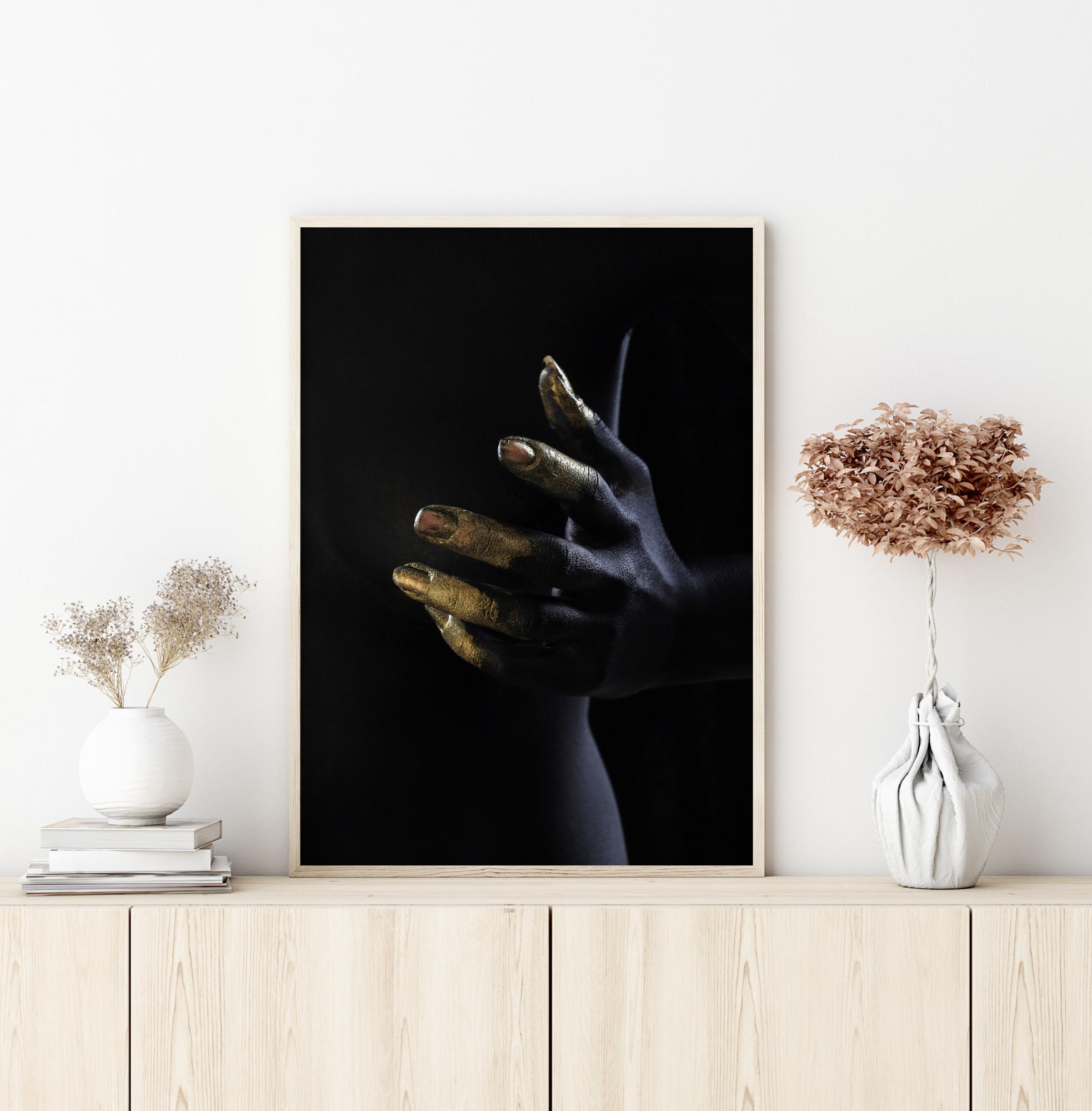 Контрастен постер, изпълнен с драма, със протегната ръка. Половината ръка е черна, докато пръстите са боядисани в злато, когато ръката е протегната. Част от тяло може да се види, осветено отдясно, за да изпъкне на черния фон. Наистина артистично изображение, което е перфектно за неутрална стена.