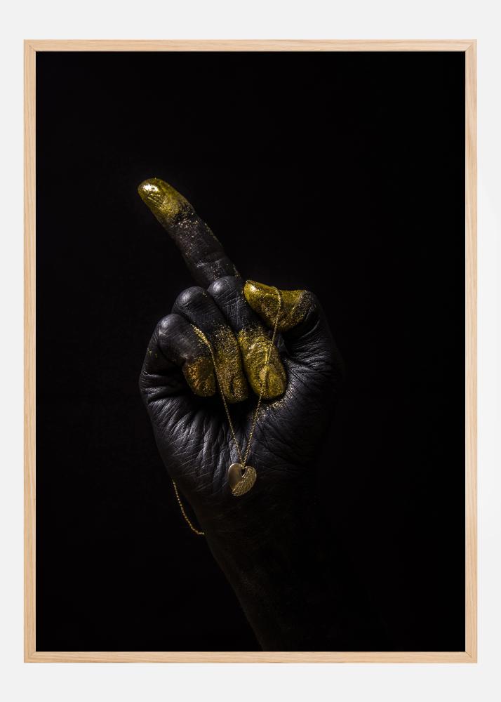 Драматичен плакат с черна ръка със златни пръсти, сочеща наляво. Затворената юмрук използва показалеца, за да посочи нещо, което не можем да видим. Около ръката виси златен медальон, който пада елегантно върху златистите пръсти. Закачете това на бяла или кремава стена за силно впечатление.