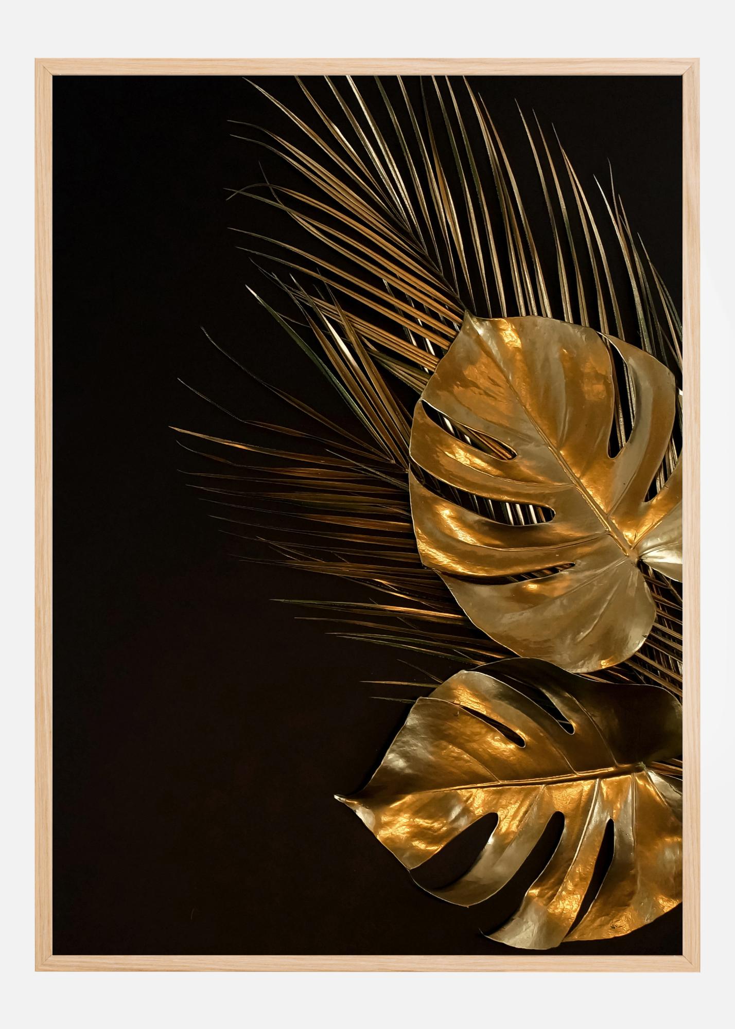 Плакат с природен мотив със светли златни листа на черен фон. Златни листа от Монстера и листа от папрат в златен цвят запълват тази невероятна картина. Блясъкът на златото създава сияние, което въпреки черния фон озарява стаята с елегантно, но все пак празнично усещане.