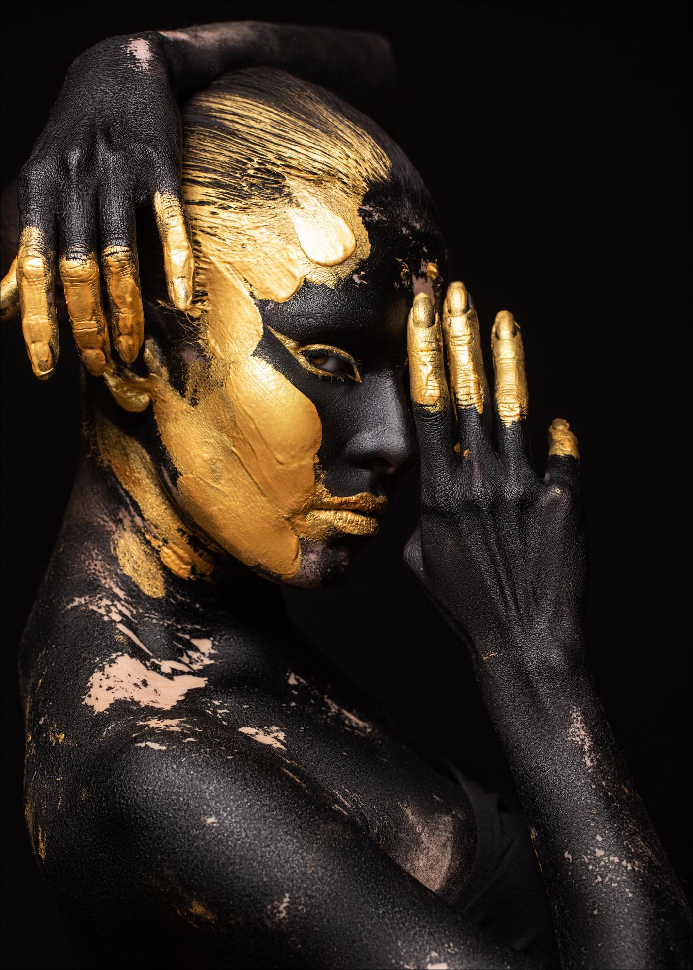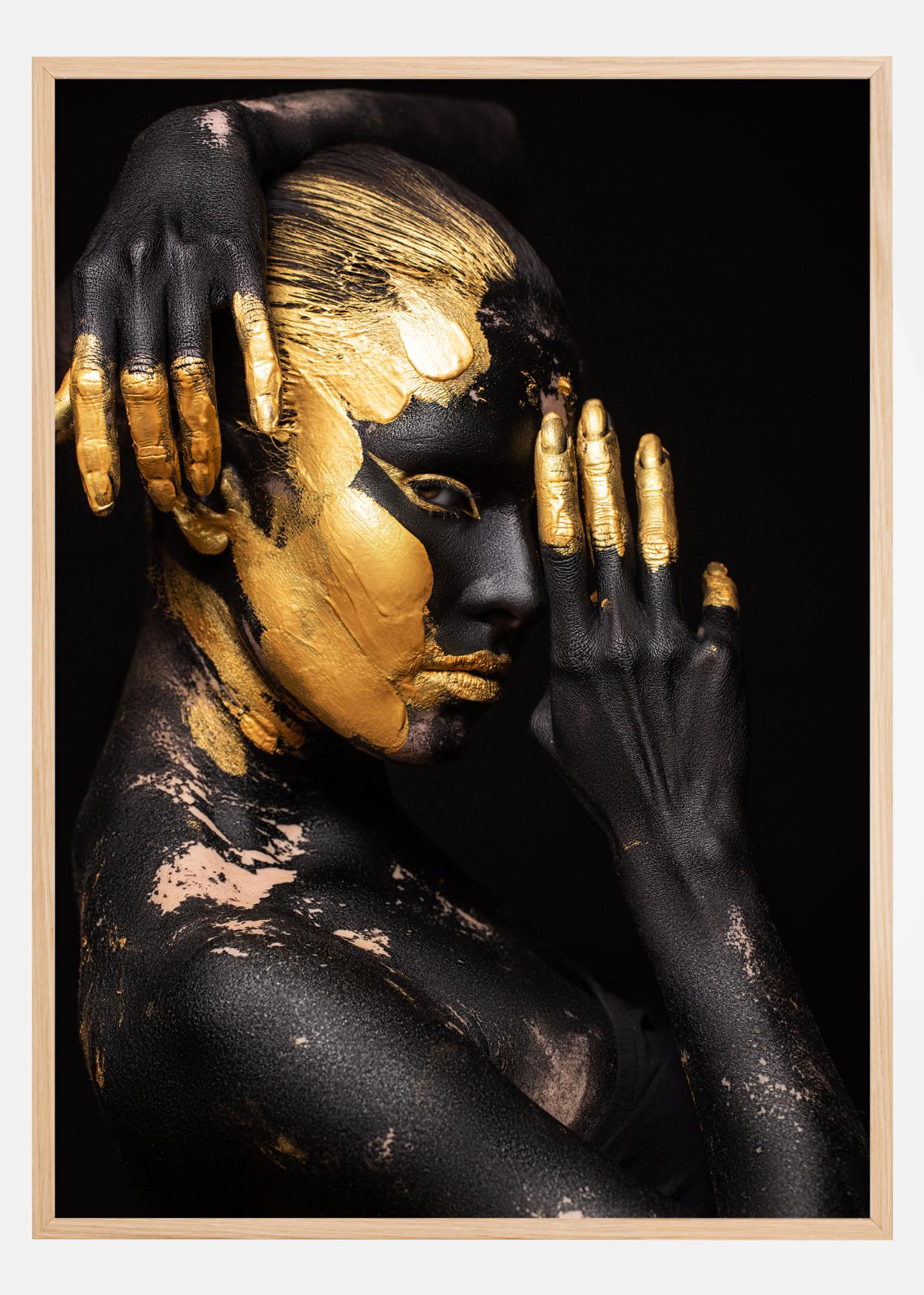 Блестящ плакат с портрет с профила на жена, която държи едната ръка пред лицето си, а другата ръка е преметната над главата. Жената е нарисувана в черно и златно, за да придаде драматичен ефект и да изпъкнат различните части на нея, докато тя гледа към теб с крайчеца на окото си.