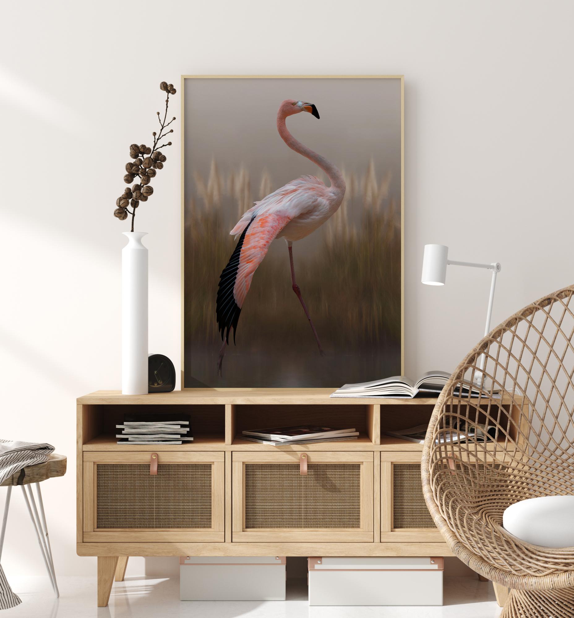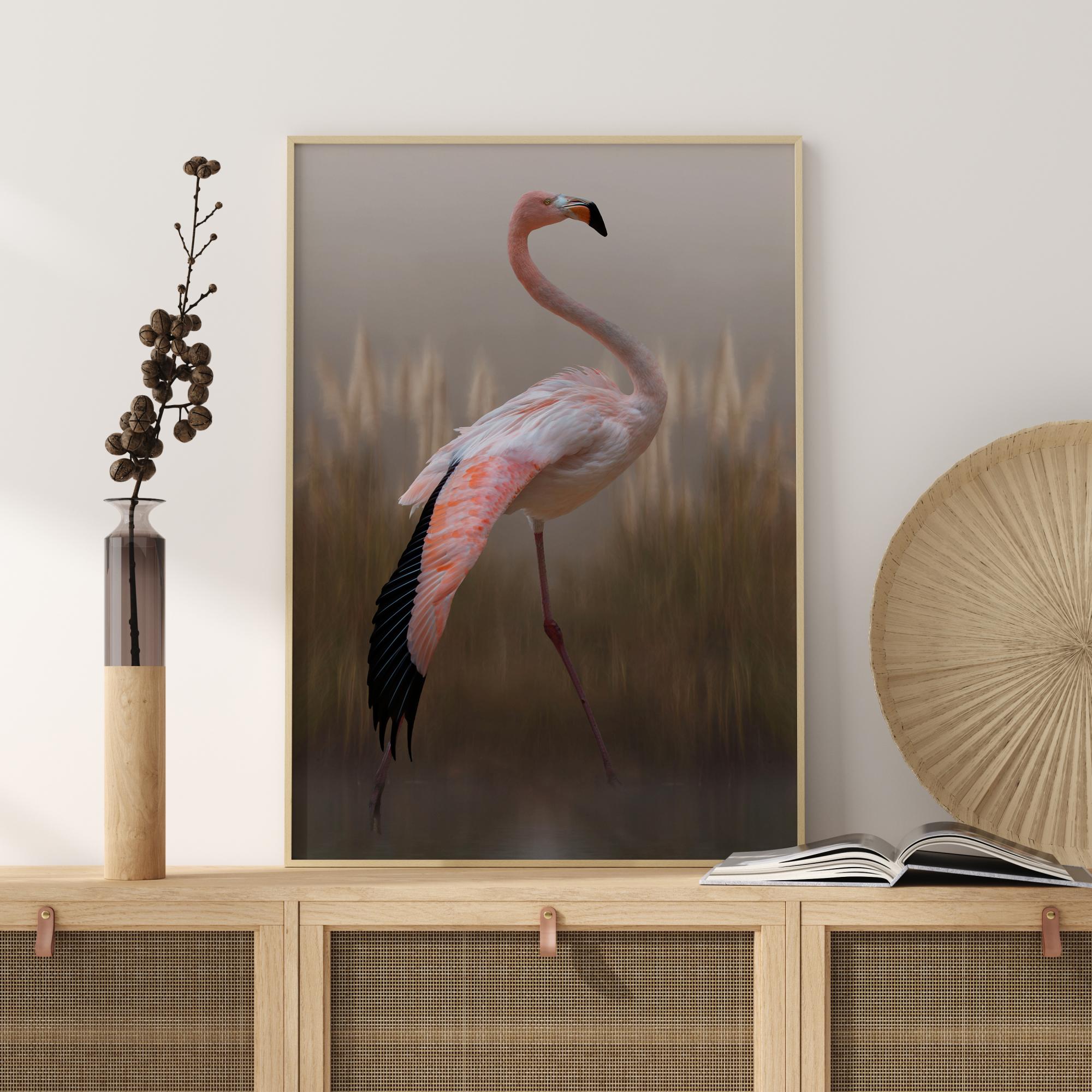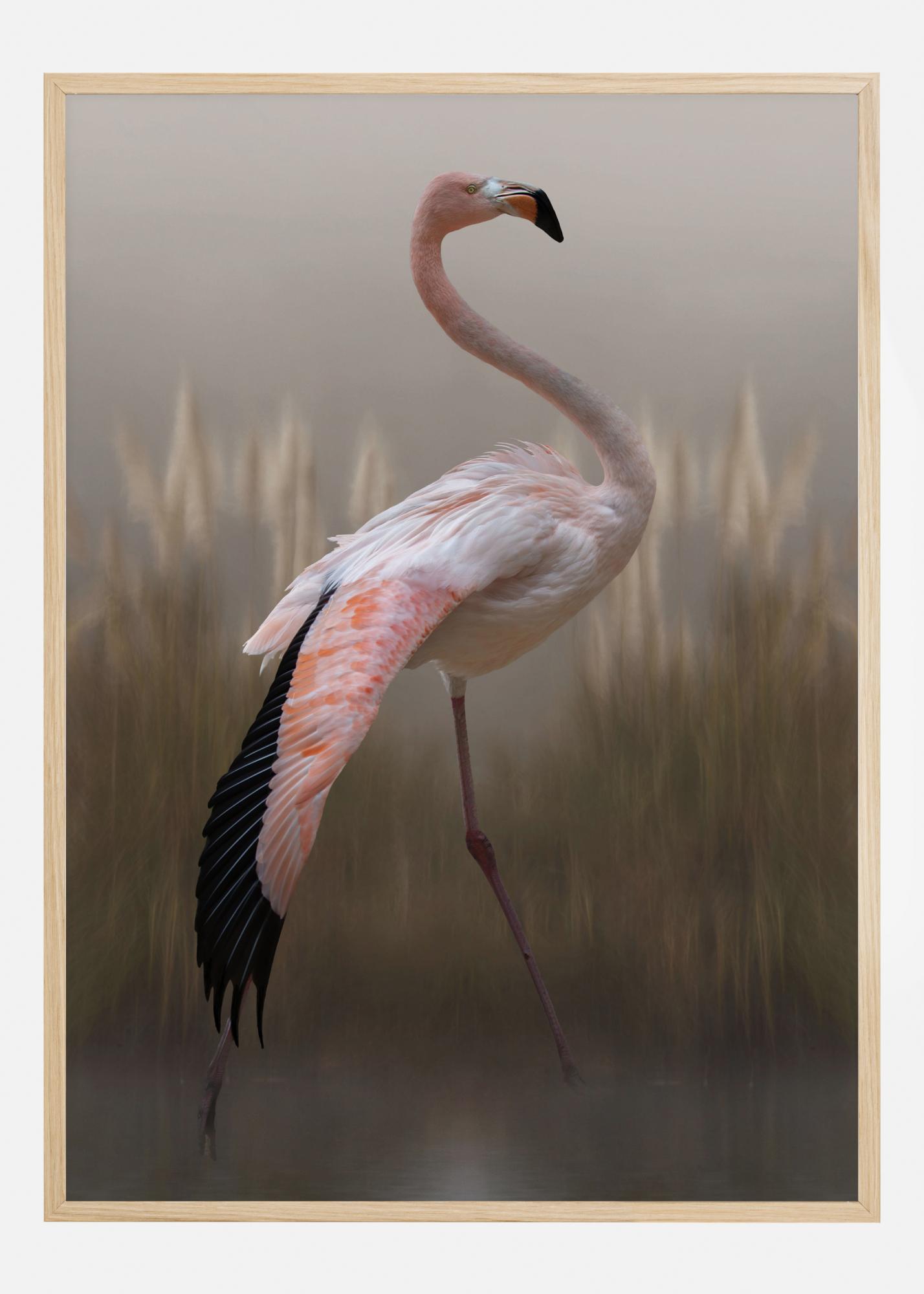 Постер на животно с парадна розова фламинго. Цветовете и замъглеността на снимката създават почти усещане за картина. Може да си представите, че стъпвате заедно с птицата, когато комбинирате този постер с обикновена синя стена.