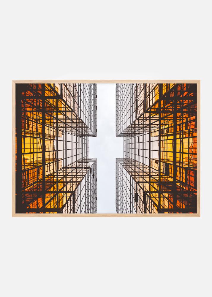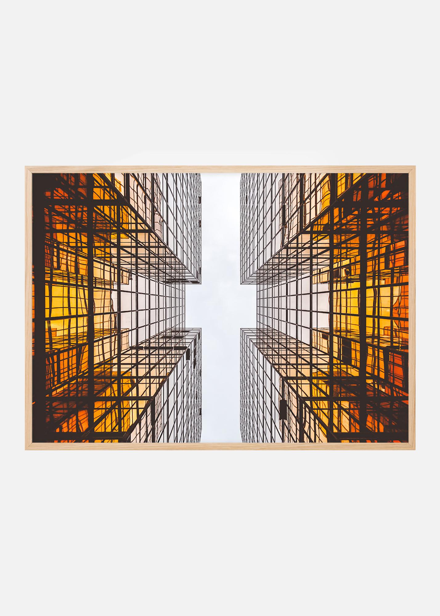 Плакат с футуристична архитектура, чийто графични линии създават вълнуващ модел. Цветовете преминават от дълбоко оранжево в основата на сградата към бялото небе. Постерът изглежда добре с по-тънка рамка както в минималистичен интериор, така и в други стилове с графични елементи. Съчетавайте с други картини на вълнуваща архитектура или градски средища.