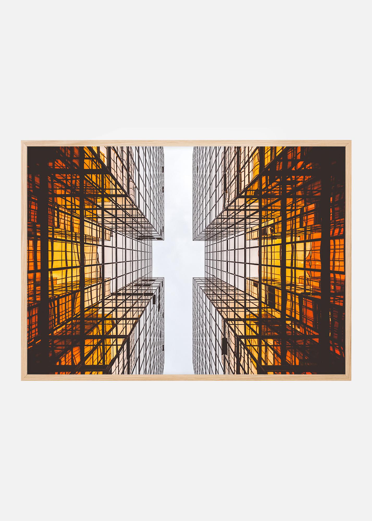 Плакат с футуристична архитектура, която със своите графически линии създава вълнуващ модел. Цветовете преливат от дълбоко оранжево в основата на сградата към бялото небе. Плакатът изглежда добре с по-тънка рамка както в минималистичен интериор, така и в други стилове с графически елементи. Съчетавайте с други картини на вълнуваща архитектура или градски пейзажи.