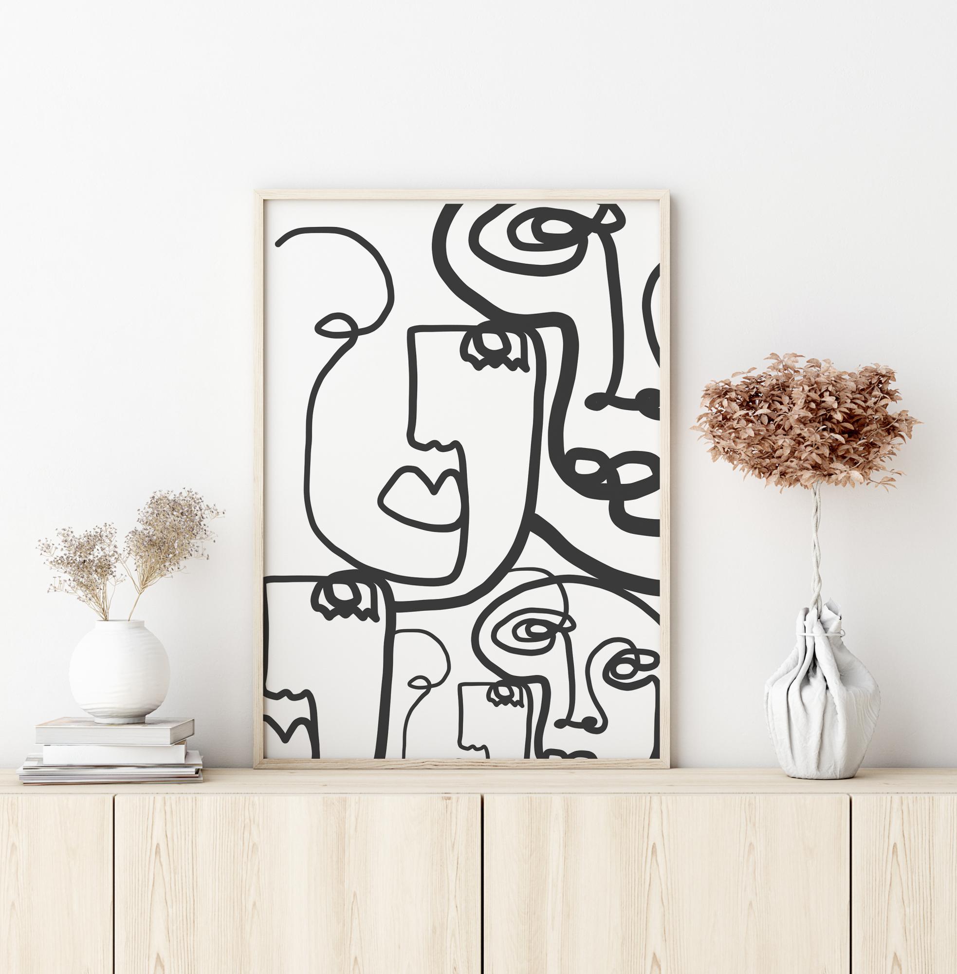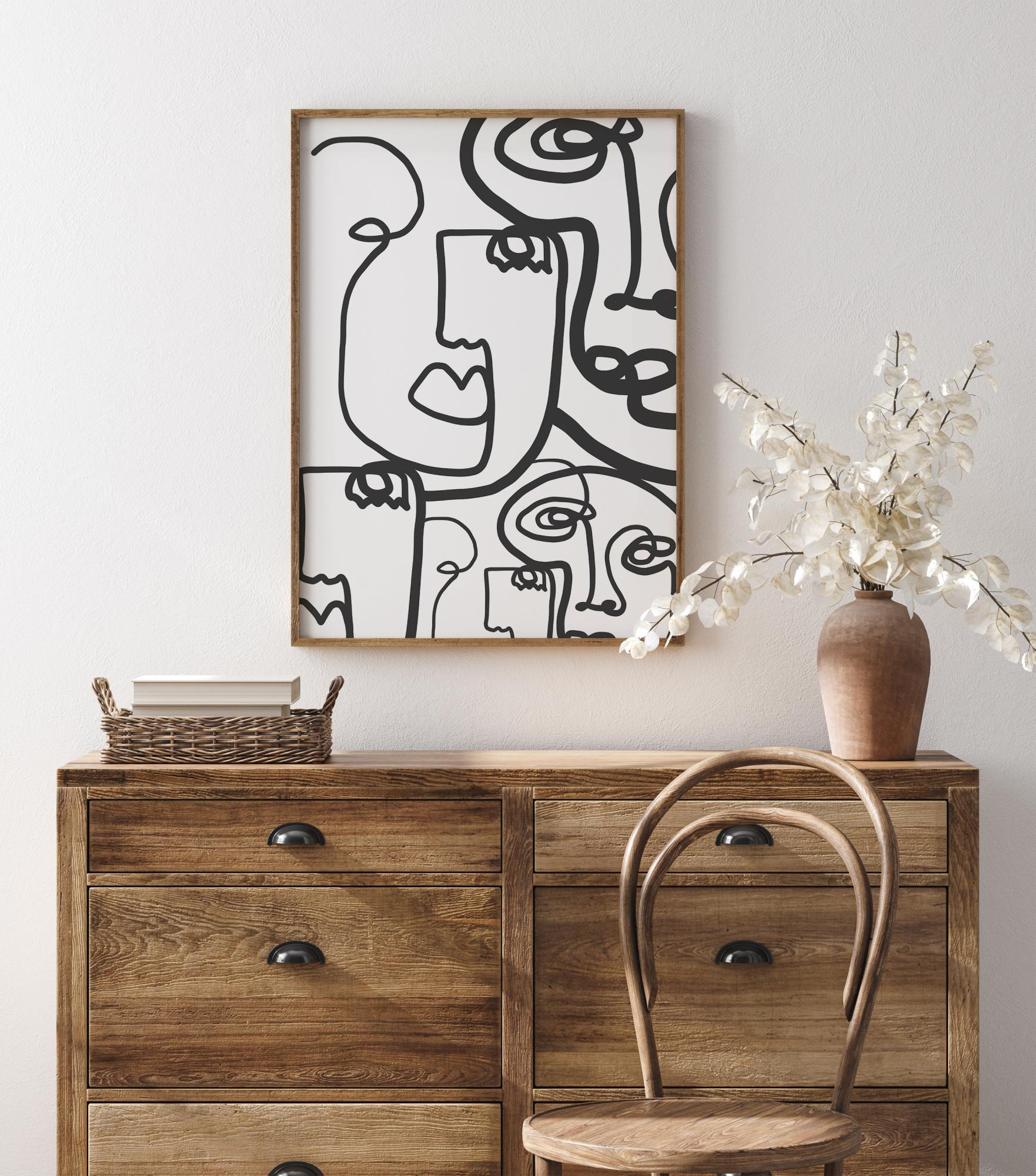 Драматичен абстрактен постер с много рисувани лица. Дебели и тънки черни линии изпълват тази картина, за да създадат пет отделни лица. Линиите се въртят около белия фон, така че трябва да се концентрирате, за да откриете всички лица, които се крият в тази жива картина.
