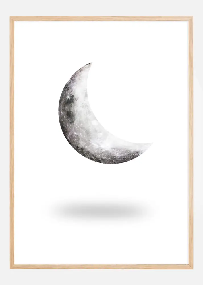 Този постер представя очарователна илюстрация на луната в нейната растяща фаза, където тъмните кратери и по-светлите височини създават завладяващ модел върху повърхността. Чистият и минималистичен дизайн на луната, с нейния детайлен текстурен фон върху чисто бялата фонова, прави тази картина вечна и може да внесе усещане за спокойствие и универсална красота във всяка стая.