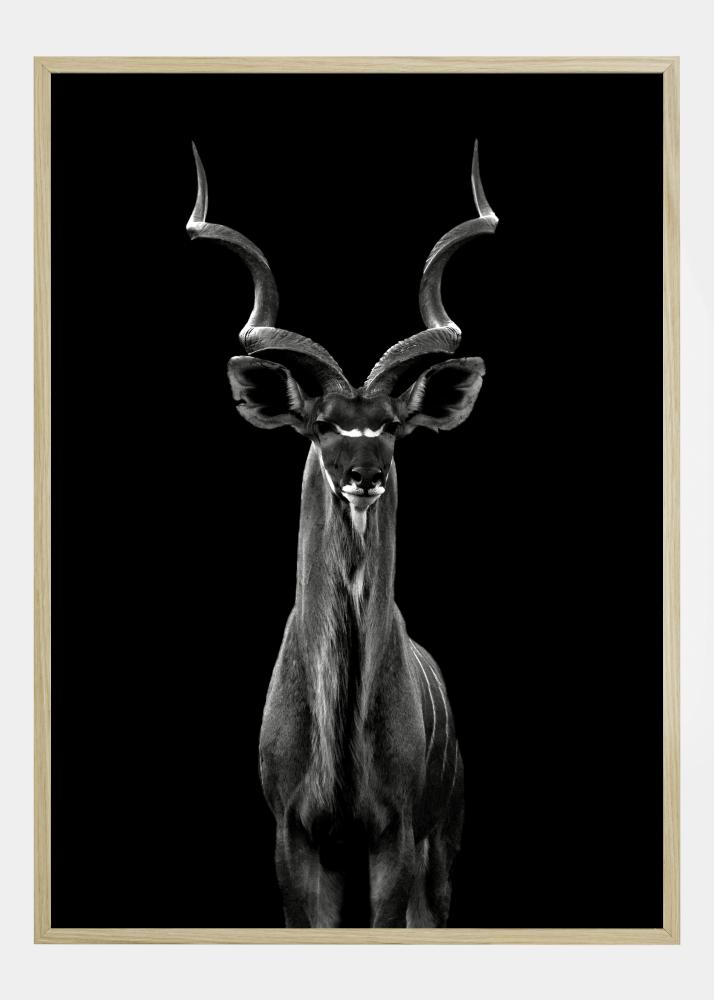Плакат за дивата природа с голям Куду, който стои величествено на черен фон. Тази величествена антилопа се взира в камерата, докато завитите рога се стремят нагоре, за да запълнят изображението. Добавете този страхотен черно-бял портрет на животно към дома си за нотка на величие.