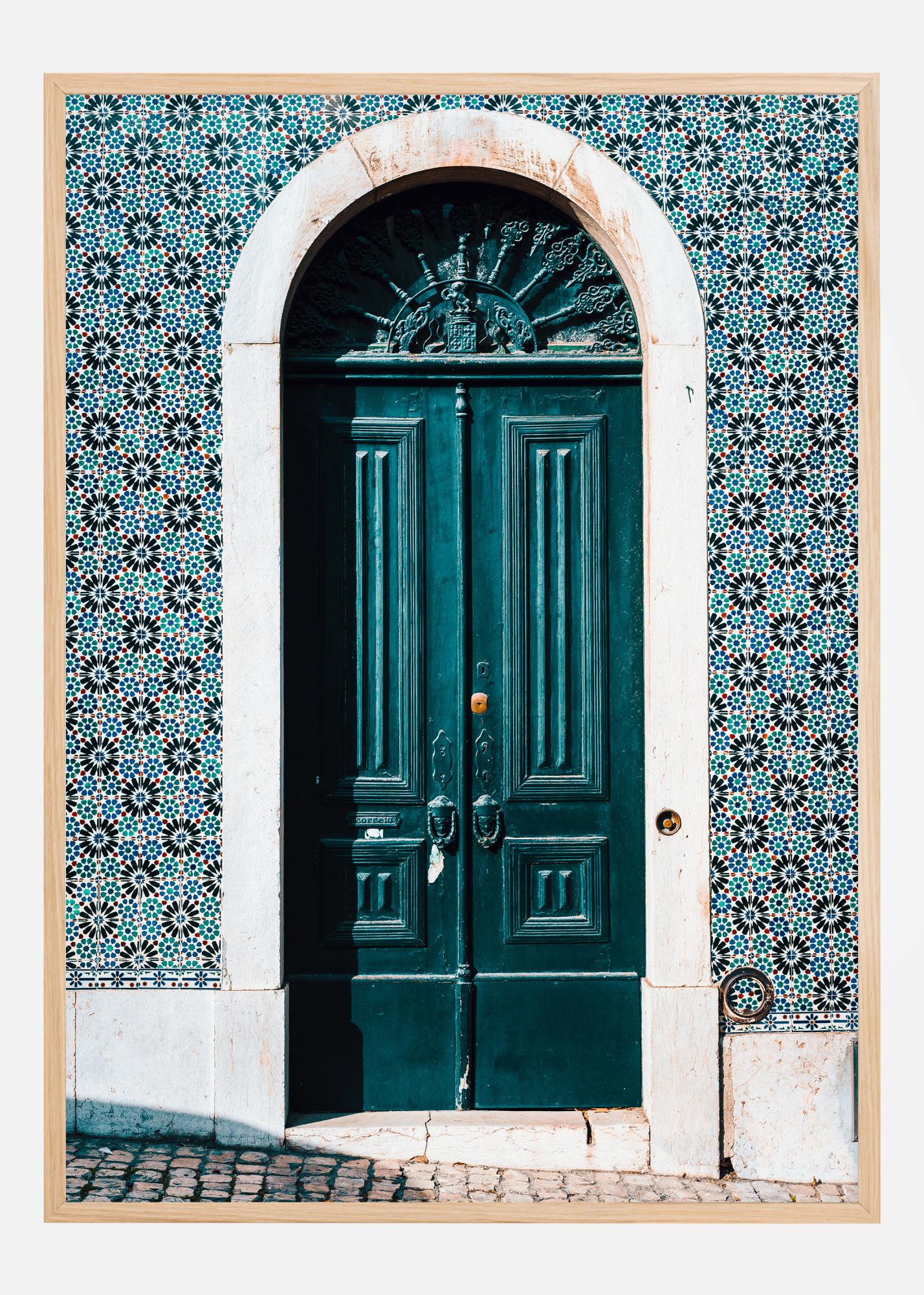 Този стилен плакат показва величествена зелена врата, красиво обрамчена от традиционни, детайлни керемиди в синьо и бяло. Класическият дизайн и смелият цвят на вратата контрастират с инрекатните мотиви, създавайки усещане за гостоприемство и културно богатство. Изображението предава усещането за поканващ вход към дом, изпълнен с история и характер.