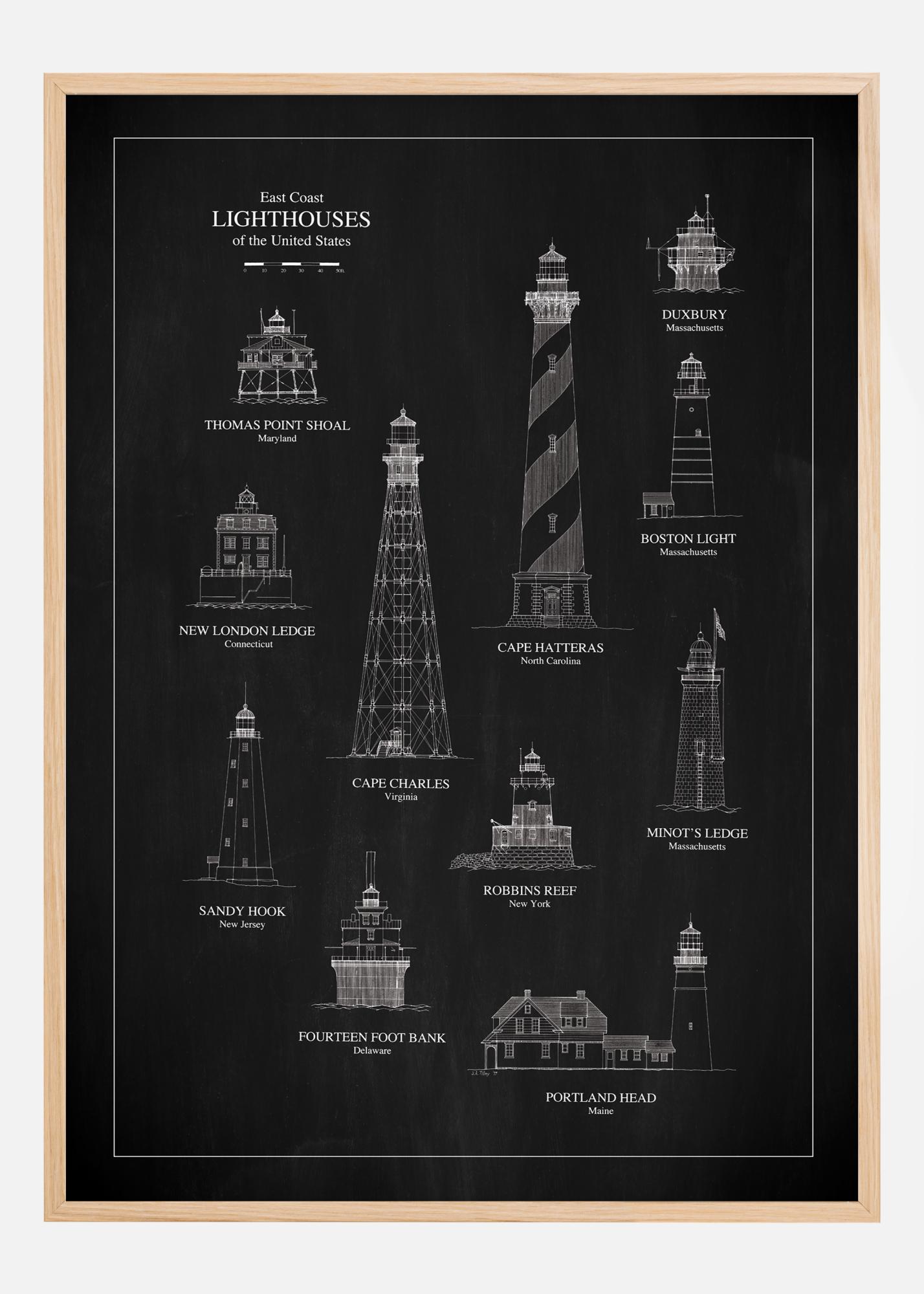 Нека вашите стени следват морска винтидж тема и ги декорирайте с нашите плакати с мотиви на фарове и кораби! Този оригинален плакат напомня на черна дъска с изящен мотив, който изглежда нарисуван с тънък, бял тебешир. Мотивът представя 11 красиви фара, разположени по източното крайбрежие на САЩ. Мечта за всеки, който харесва архитектура и чертежи! Тъй като плакатът е наличен в различни размери, ще намерите лесно такъв, който да пасне на вашия дом. Допълнете го с бяла или златиста рамка.