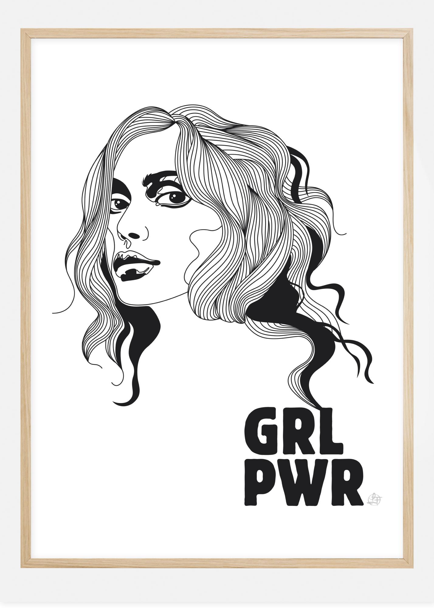 Плакат с графична илюстрация, изпълнена с настроение и послание Girl Power (grl pwr), създадена от Линда Форсберг. Проста и стилна текстова плакат с ясно послание.