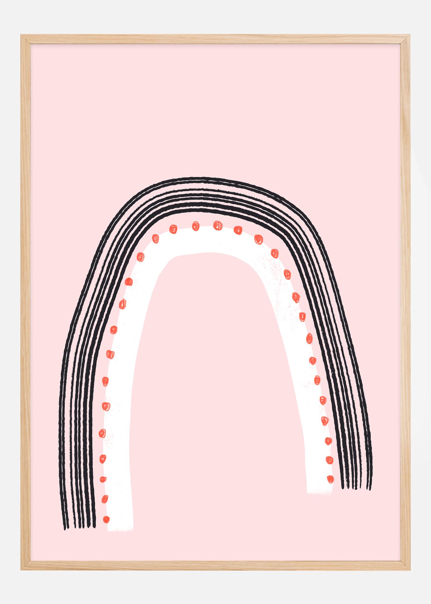 Този игрив и очарователен плакат изобразява стилизирана дъга с модерен и графичен подход. На светлорозов фон смелите черни контури на дъгите създават ясна контрастност, докато редици от малки червени сърца следват една от кривите, добавяйки неустоимо усещане за радост и позитивност. Тази картина излъчва простота и радост и може да озари всяка стая със своя чар и приятелско излъчване.