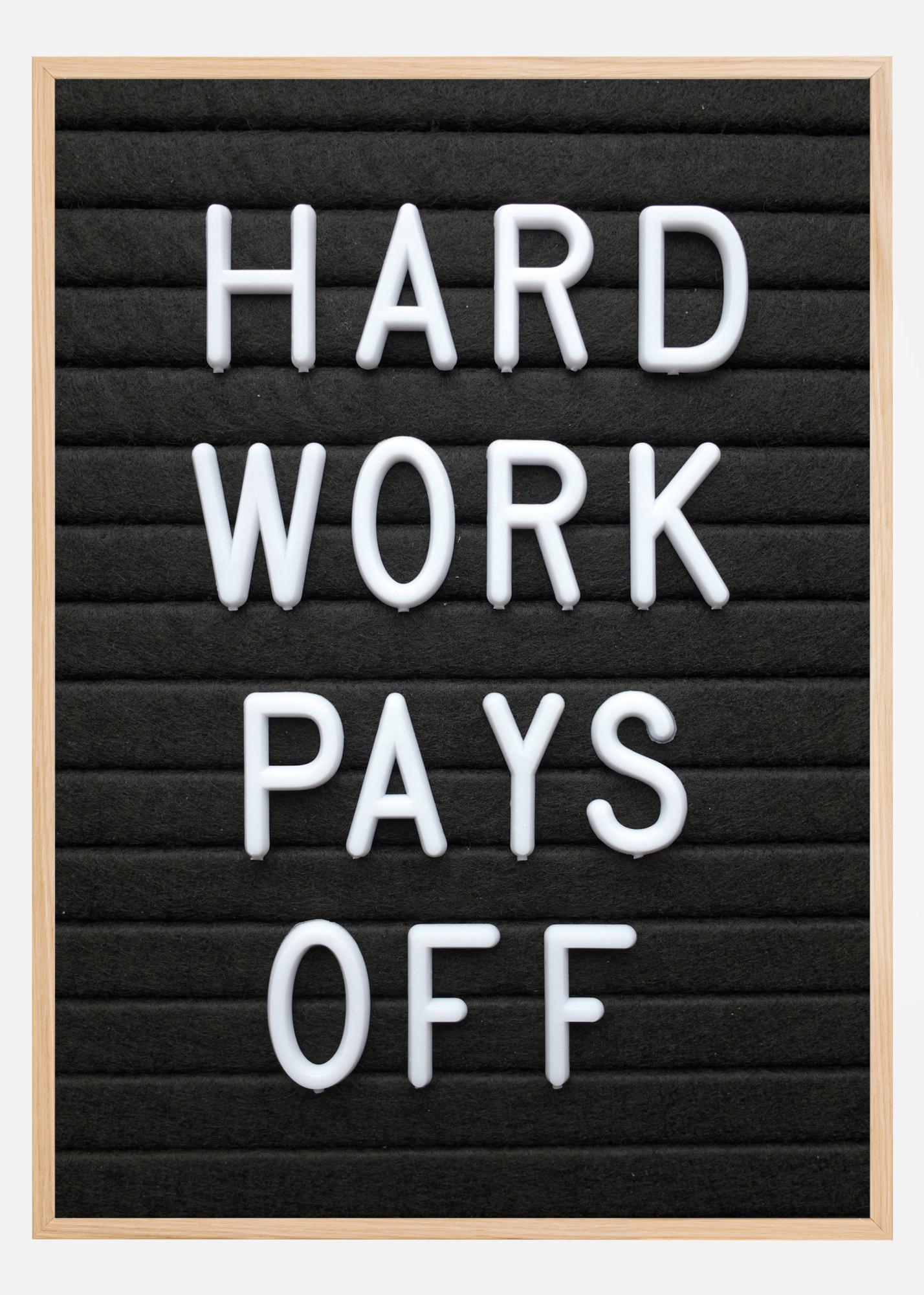 Един прост, но ефективен постер с думите "Трудната работа се отплаща". Големи бели букви на черен фон предават много силно послание до този, който види изображението. Перфектен постер за окачване на бяла стена в офис обстановка.