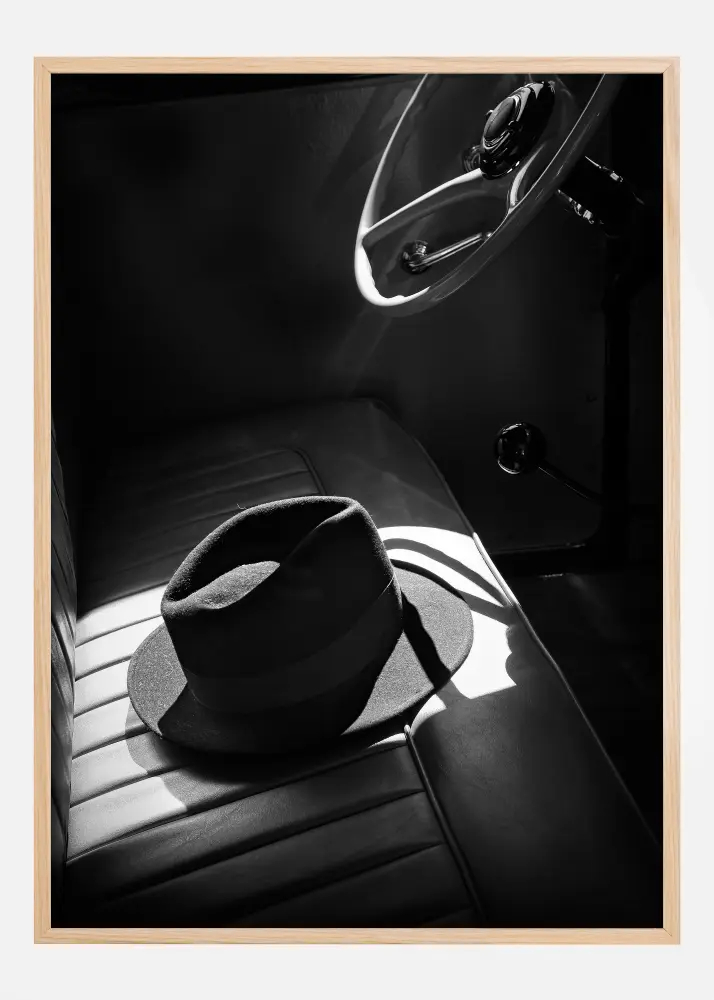 Този изискан черно-бял постер улавя същността на винтидж елегантността със своето вечнозелено представяне на класическа филцова шапка, поставена върху седалката на стар автомобил. Мотивът, внимателно рамкиран от сенки и играта на светлината, създава атмосфера на носталгия и лукс. Смелите контрасти между черната кожена седалка, блестящия хромиран волан и емблематичната шапка акцентират класическите тонове на черно, бяло и сиво в изображението.