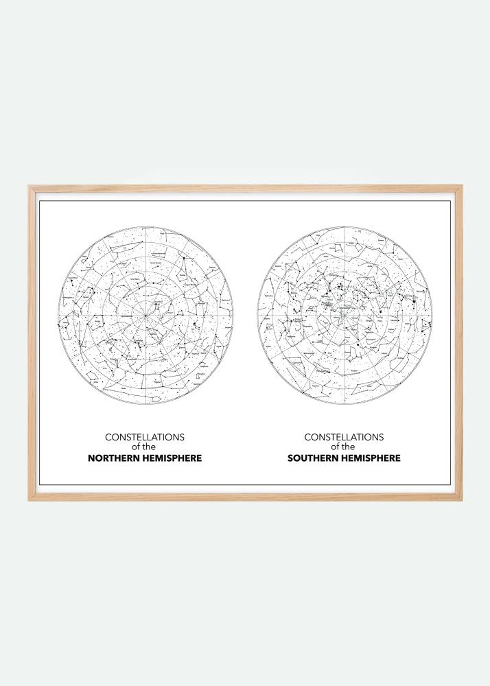Черно-бял печат с северното и южното звездно небе. На белия фон съзвездията са слабо очертани в черно. Поставени един до друг, можете да се възхитите на мистерията на звездите. Окачете тази картина в работната си стая и създайте усещане за безкрайност.