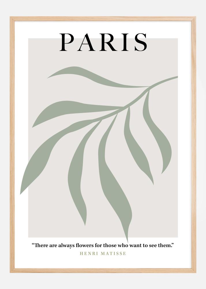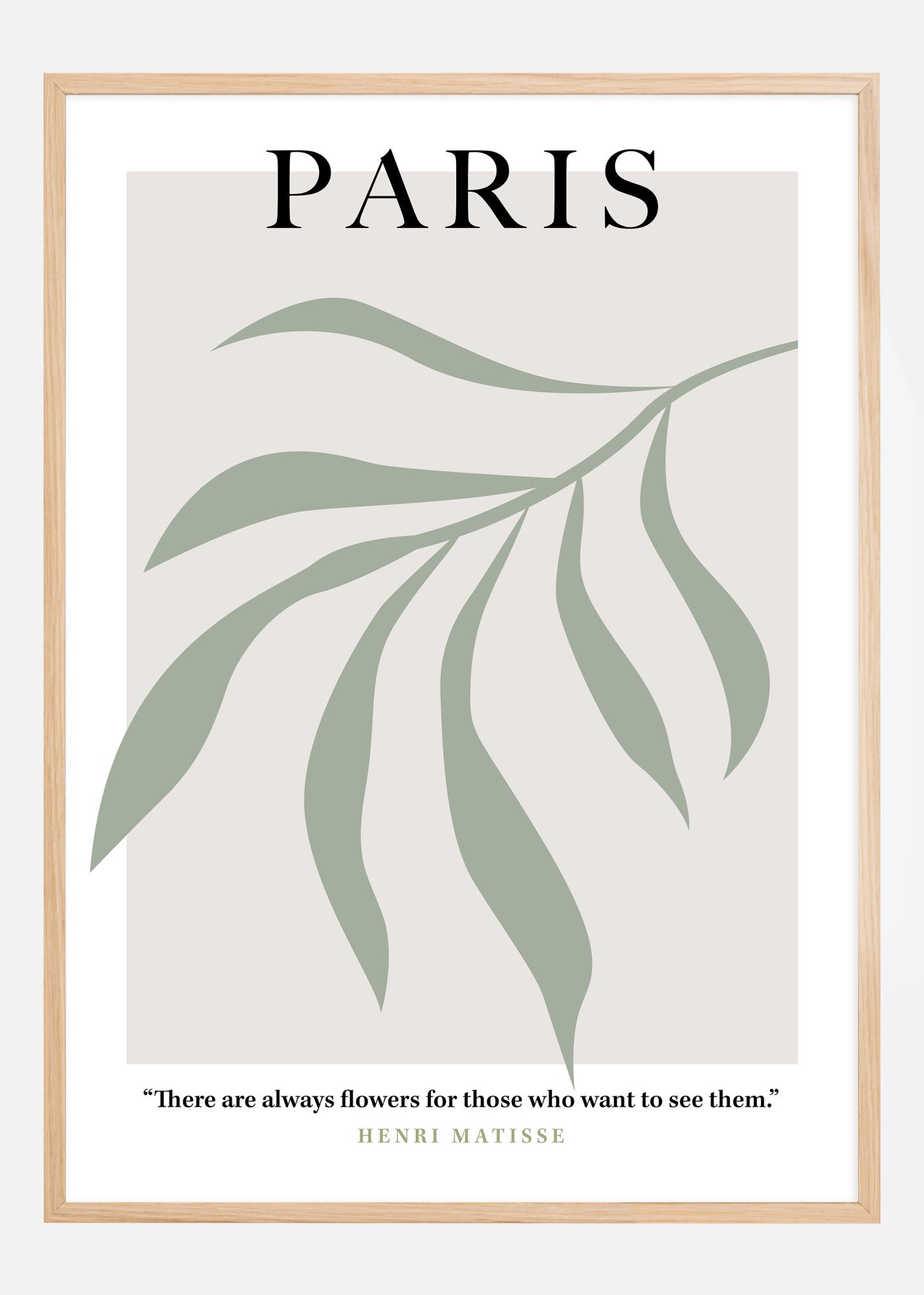 Този стилен и елегантен постер носи думата "ПАРИЖ" в големи букви, върху фон от меки зелени линии, които образуват абстрактна, органична форма, напомняща за спокойни и прохладни градини. Неговата приглушена палитра дава усещане за мир и фина елегантност, което отразява репутацията на града като център на красота и култура. Той е допълнен от вдъхновяващ цитат на Анри Матис, който придава на постера дълбочина на художествена мъдрост: "Винаги има цветя за тези, които искат да ги видят."