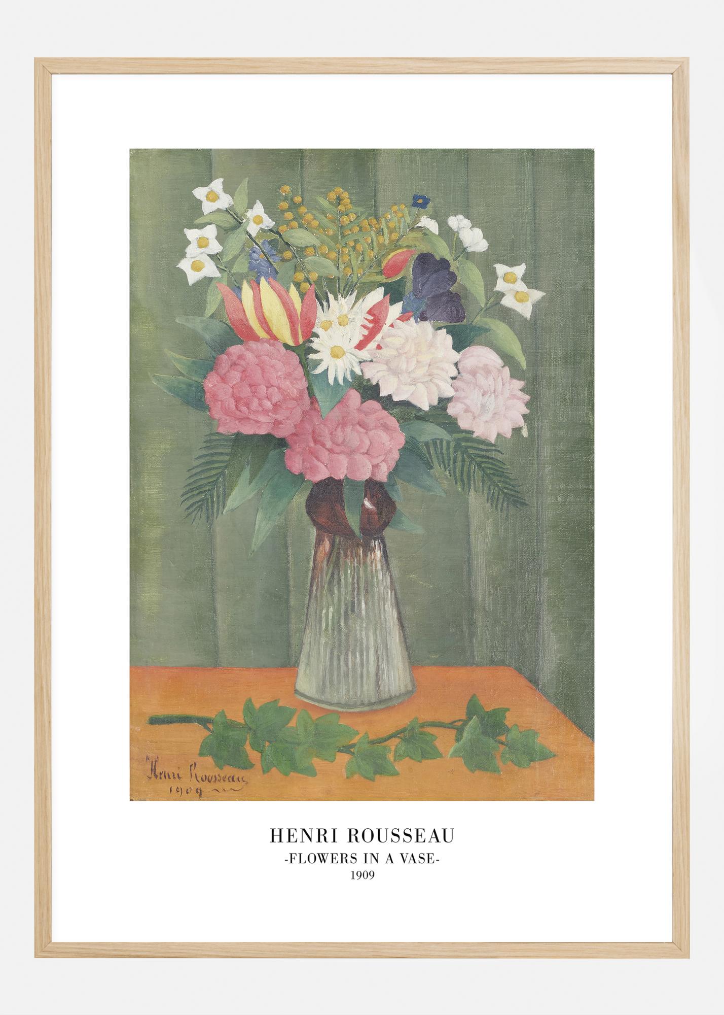 Този постер на "Цветя във ваза" от Анри Русо от 1909 г. показва красива и многоцветна букет цветя, чието сладко и детайлно изображение навежда мисли за успокояващи летни дни. Той е идеален принт за тези, които търсят да внесат чувство за красотата и мира на природата в дома или работното си място и може да добави класическо очарование към всяко пространство.