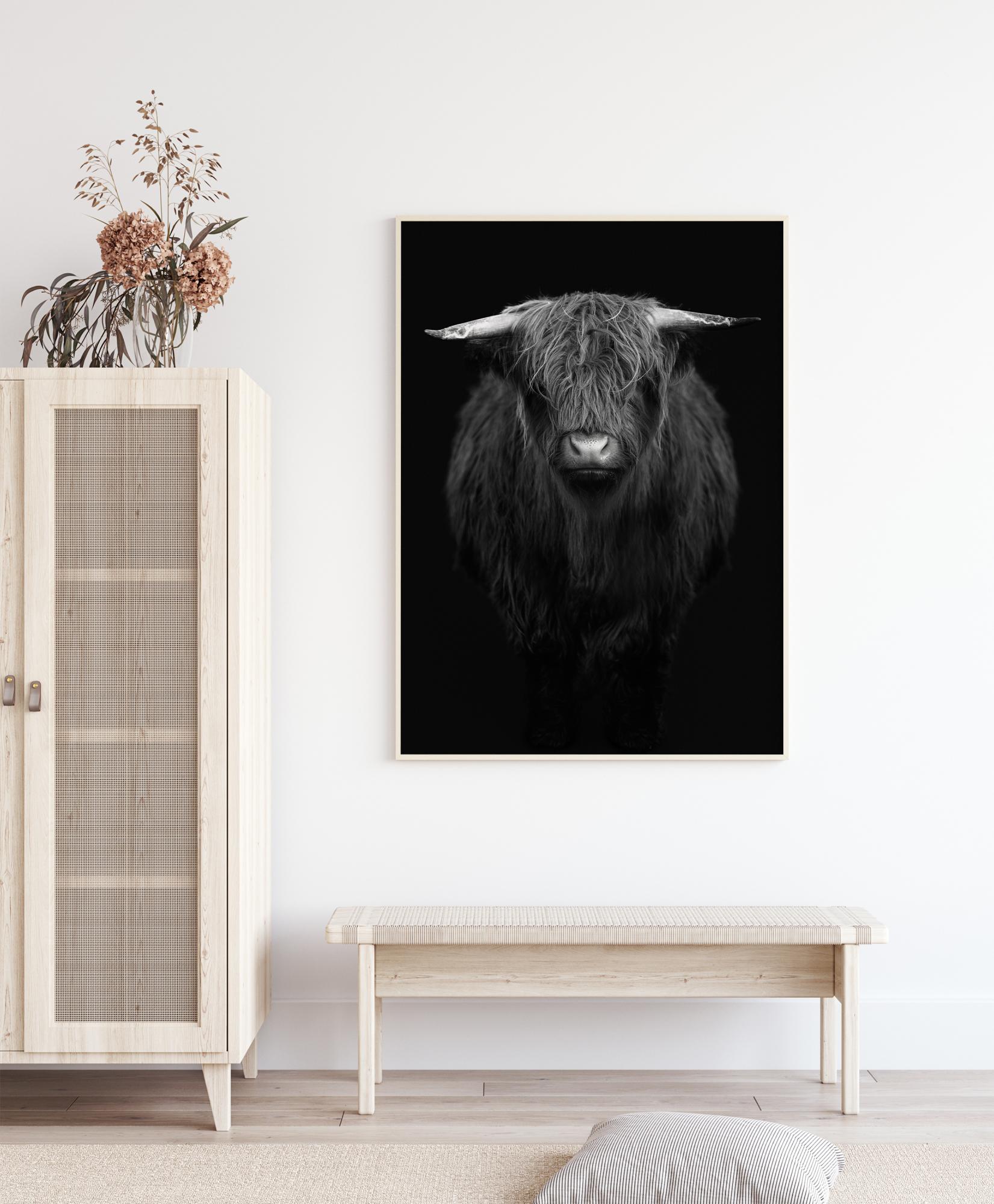 Една впечатляваща черна хайландска крава на черен фон. Това красиво създание гледа право в камерата и показва дългата си черна вълниста козина. Въпреки че този постер е изображение черно върху черно, белите рога и нос на кравата излизат ясно. Възхитете се на красотата на това създание, когато то се взира в камерата.