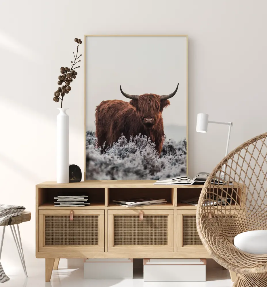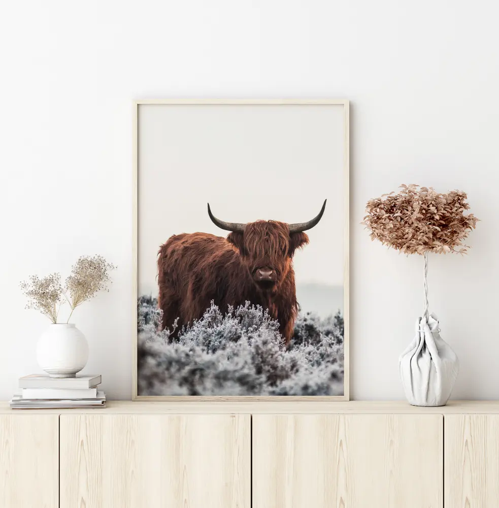 Един великолепен постер с червена шотландска крава. Когато стои пред бяло небе, почти можете да почувствате суровите метеорологични условия, където тя живее. С червената си козина и кафявия нос, тази красива крава не изглежда обезпокоена от нищо. Великолепният цвят контрастира перфектно с бялата обстановка.