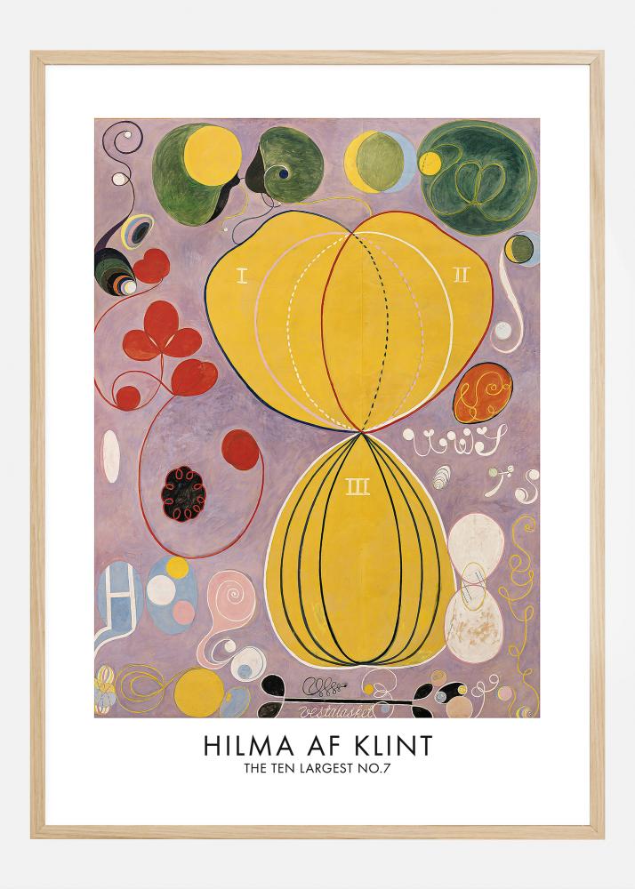 Този плакат, представящ 'The Ten Largest No.7' от Хилма аф Клинт, е истински празник за очите, изпълнен с игриви форми и смели цветове. В центъра на творбата е голяма жълта фигура, разделена на три секции, обградена от симфония на криви, кръгове и спирали в спектър от червено, зелено и синьо. Абстрактните форми и окултните елементи на лилав фон правят това произведение на изкуството мистично и медитативно преживяване. Тази арт принт предлага уникална комбинация от естетика и философия, което отразява амбицията на аф Клинт да свърже физическото с духовното.