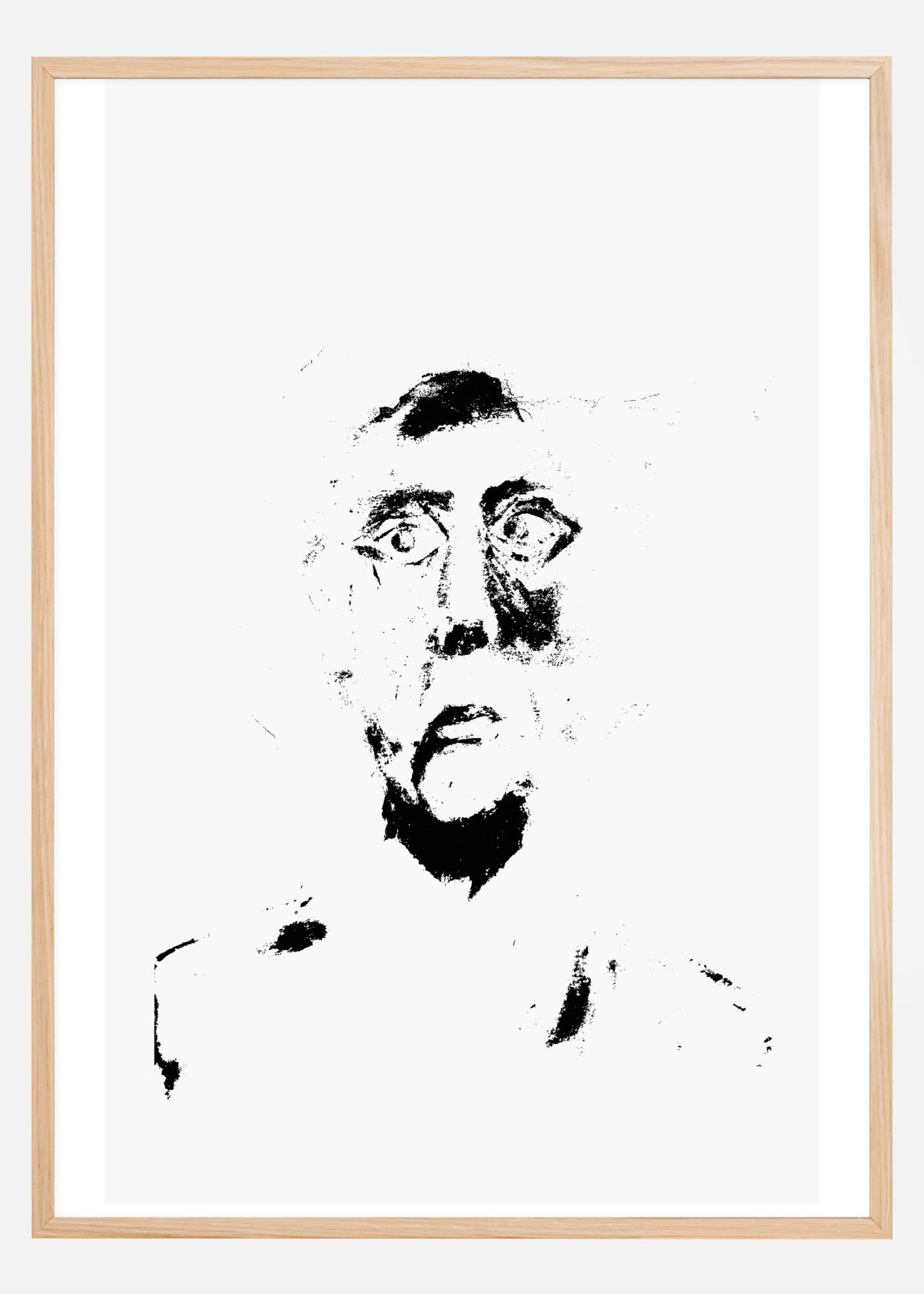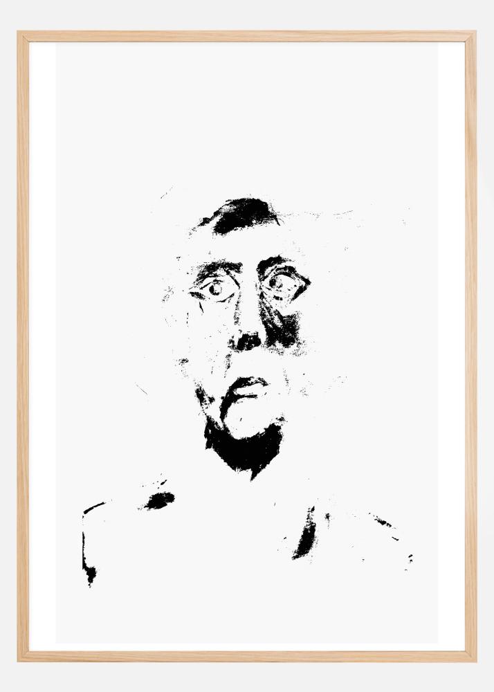 Страховит черно-бял портрет с глава и рамене. На бял фон тъмните нюанси подчертават косата, бузата и шията на човека. Големите очи на човека изразяват страх и мистика. Тъжно и страховито изображение, което предава ужасяващо усещане.