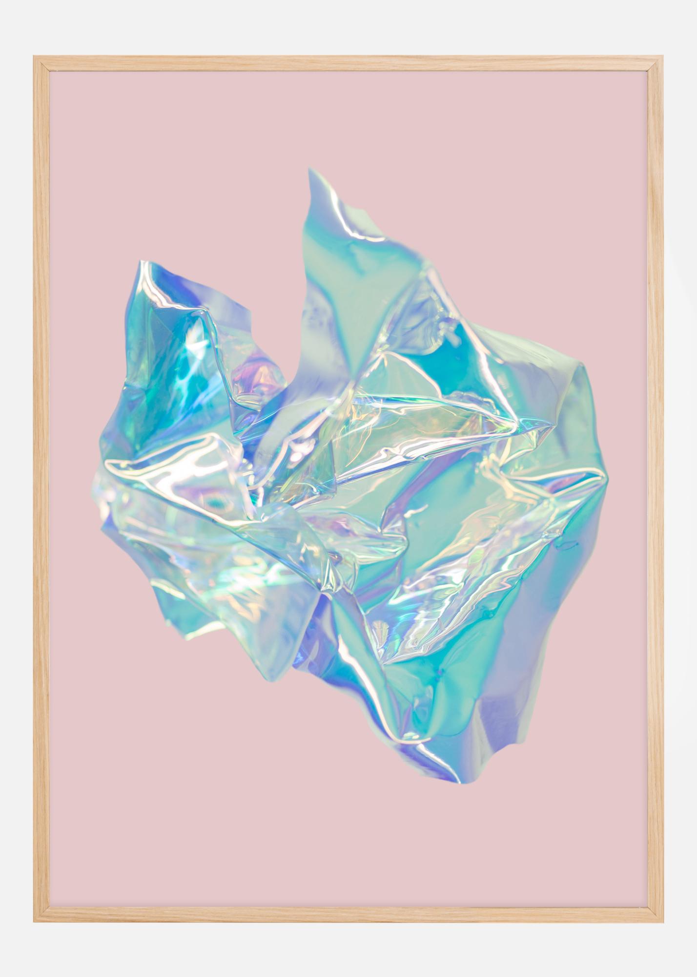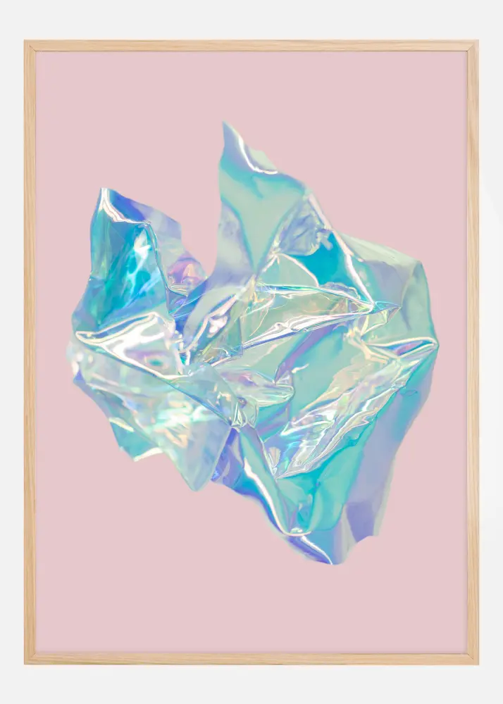 Този постер е почит към съвременното и експерименталното, където набръчкан холографски фолио плува срещу меко розов фон. Неговите отразяващи повърхности блестят в спектър от пастелни цветове, които преминават от аквамариново синьо до меко лавандулово и розово розово. Този принт е перфектна метафора за гъвкавост и промяна и се вписва отлично в модерен интериор, който цени уникални, провокативни детайли.