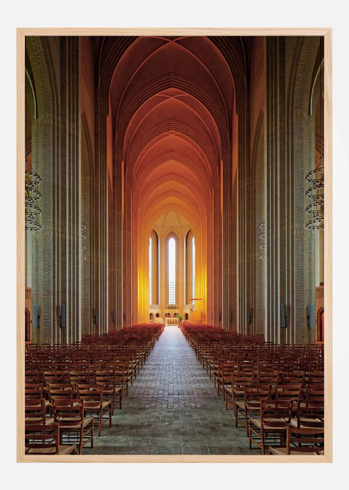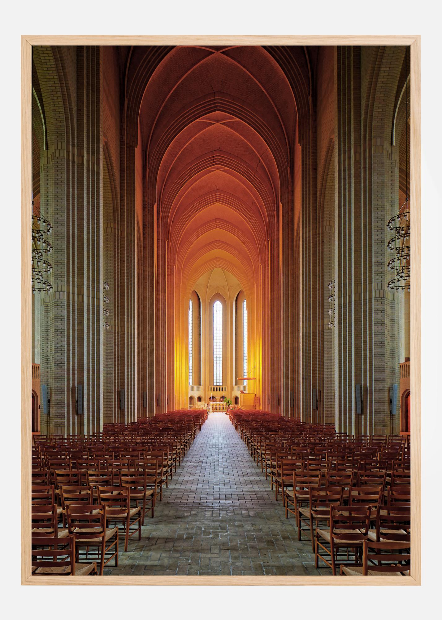 Зашеметяващ архитектурен постер в църква. Дългият църковен коридор води до олтара, а високият таван и каменните колони създават много спокойно усещане. Оранжева светлина се отразява през прозорците и създава усещане за топлина и хармония. Почувствайте спокойствието в тази картина.