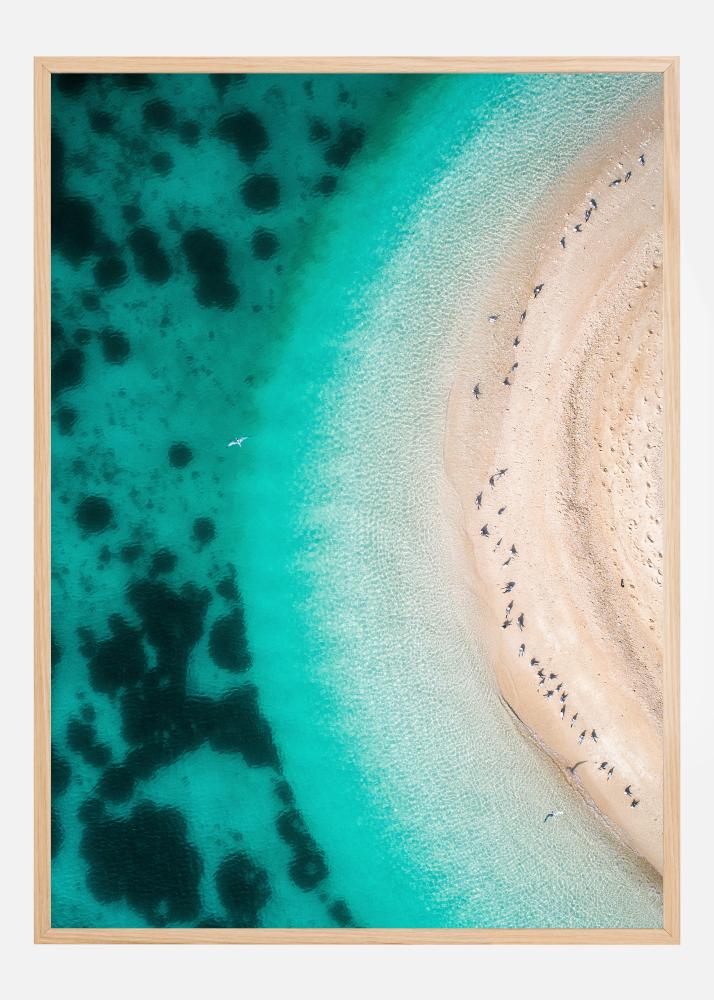 Въздушна снимка на красива плажна ивица. Великолепното тюркоазено море се слива съвършено с розовия пясък. Тъмните камъни на морското дъно добавят допълнителен цвят към този невероятен принт. Представете си, че вече се намирате на този плаж днес.