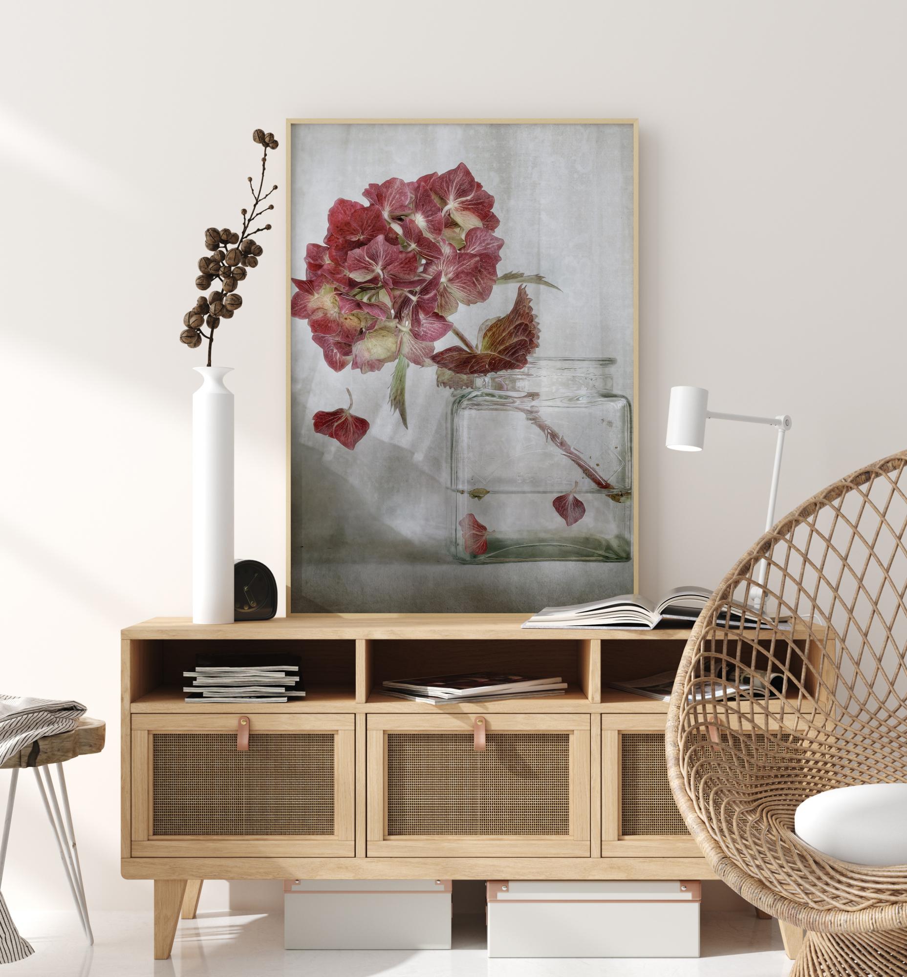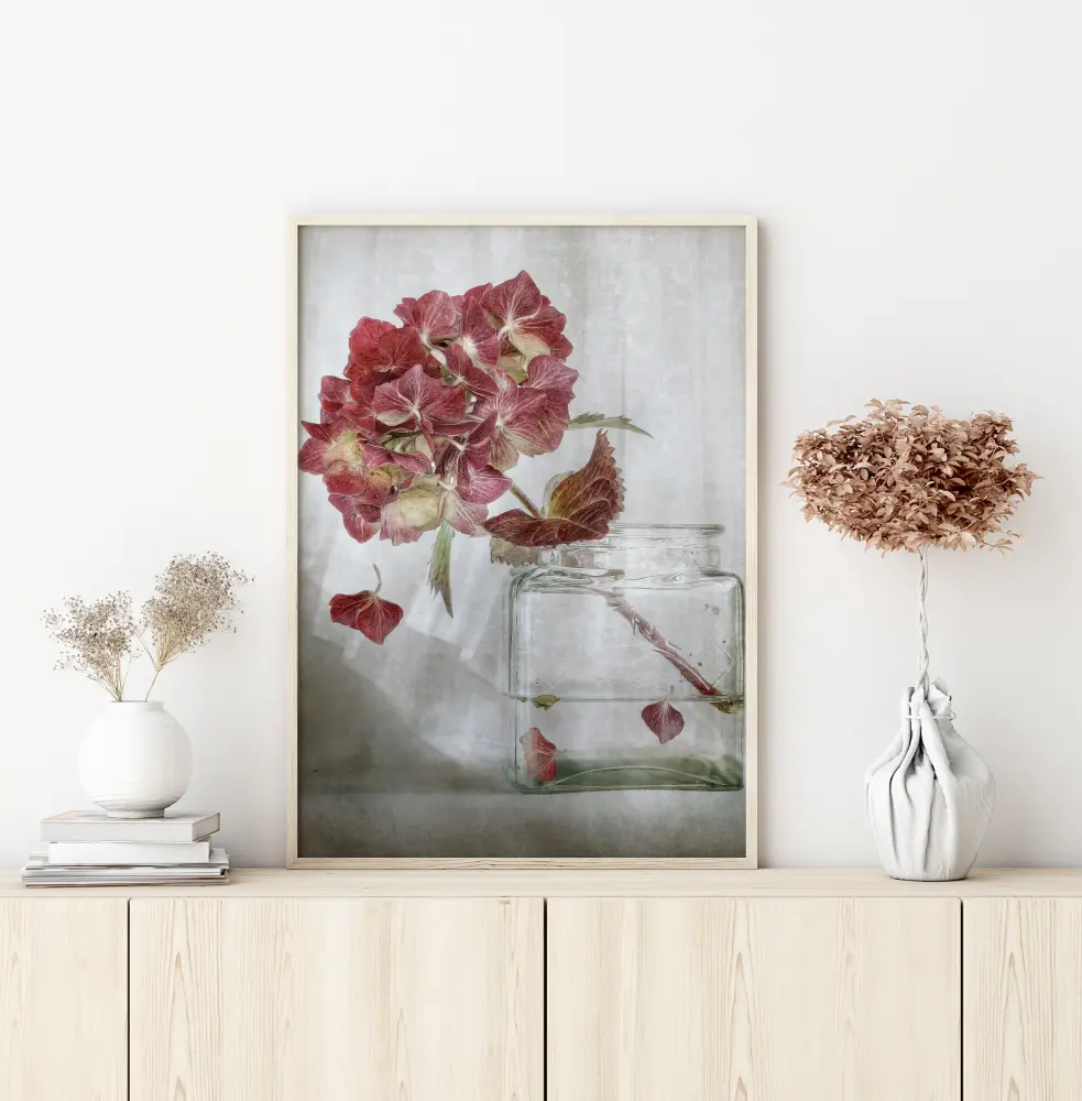Един красив натурален плакат с дръжка от хортензия в прозрачна ваза. Пред цветен бял завеса пада нежно розов листенце. Завесата се люлее при лек бриз. Тази картина почти ви кара да усетите бриза.