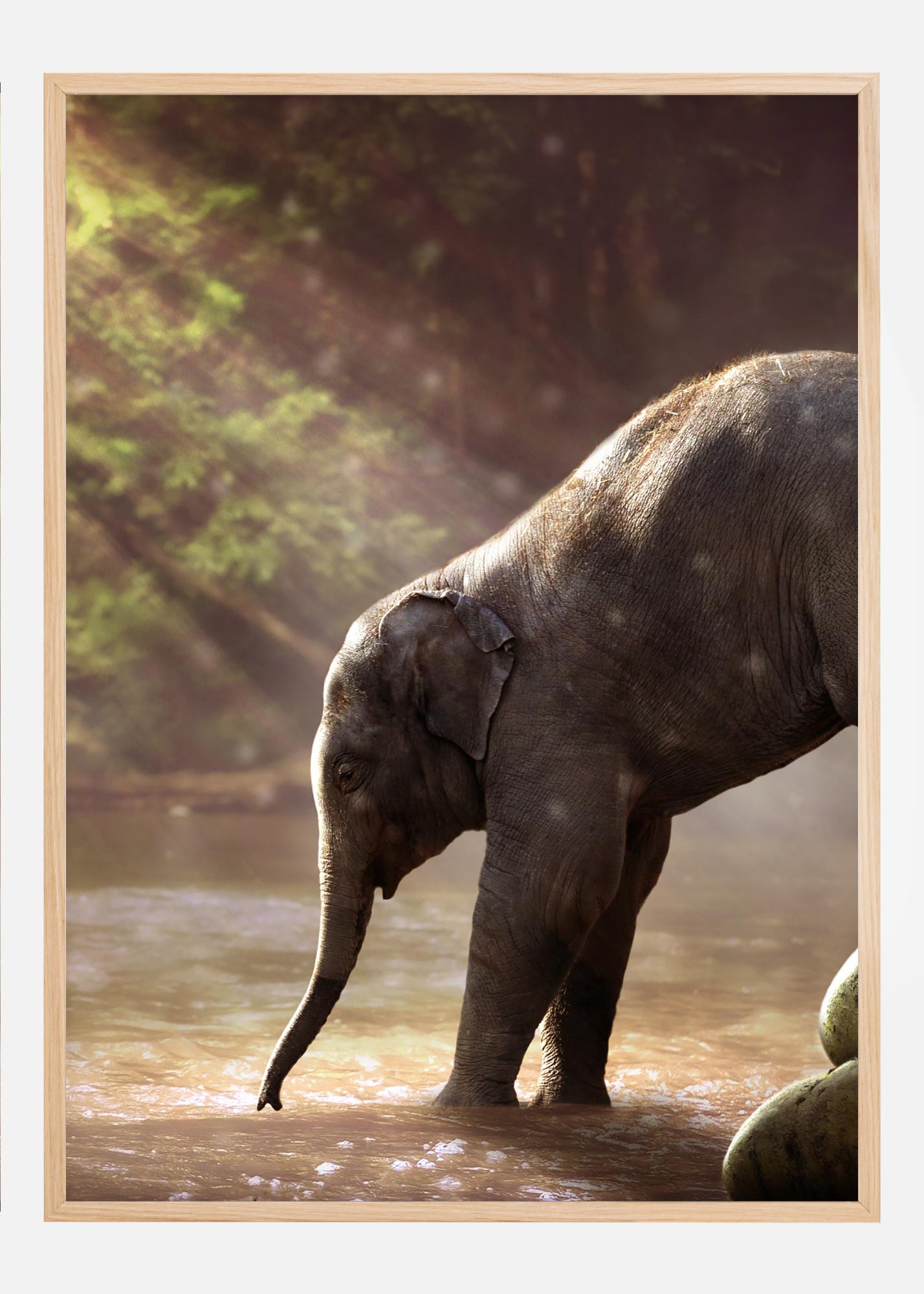 Сладка снимка на малко слонче, което е окуражавано от майка си да влезе в реката. Дневната светлина се пречупва през дърветата и се отразява във водата, създавайки усещане за топлина. Малкото слонче се колебае да влезе във водата, но майката внимателно му помага. Този сладък плакат отразява интензивната любов между майка и дете.