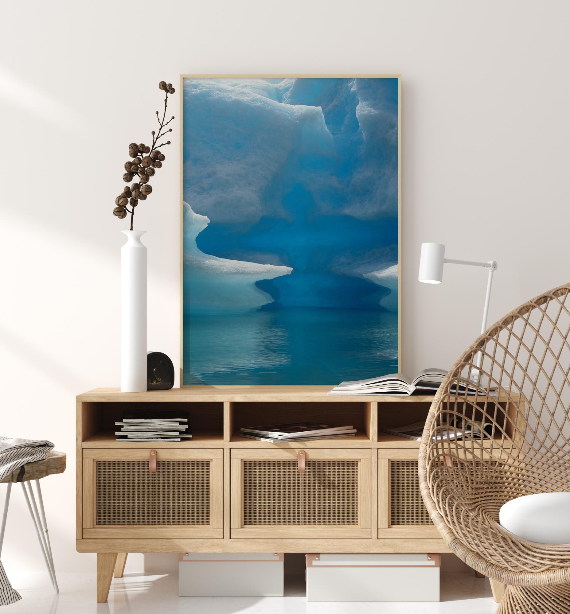 Спокоен постер с кристално син айсберг. Остри, бели айсберги се отразяват в прозрачните води на морето. Светлосиньото небе се отразява в дълбокото, студено море и създава прохладна атмосфера. Различните нюанси на синьото ще осветят всяка стая.
