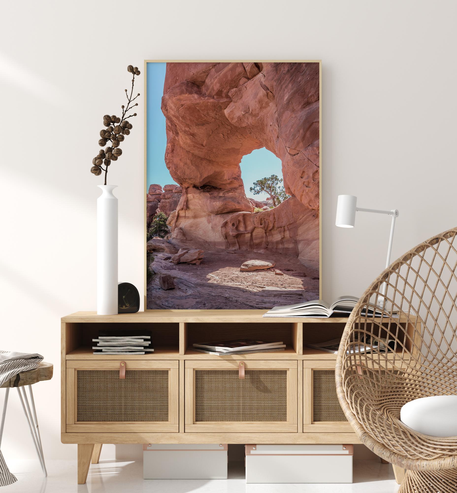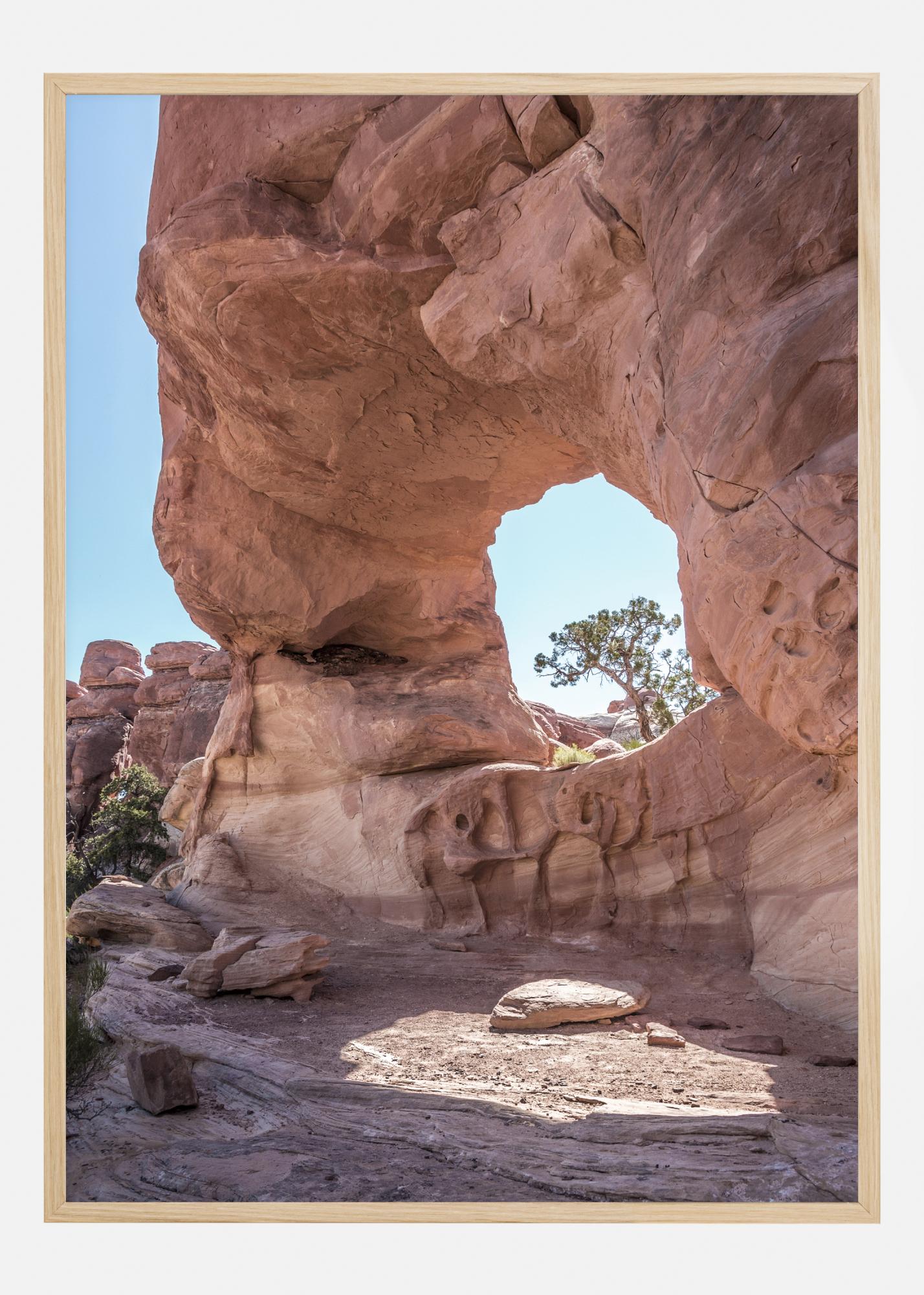 Впечатляващ природен постер на оранжева скала с дупка в средата. Малко дърво се появява от другата страна на дупката. Слънцето грее през дупката в скалата и създава засенчена област пред нея. Красивите силни цветове са идеални за осветяване на скучна стая.