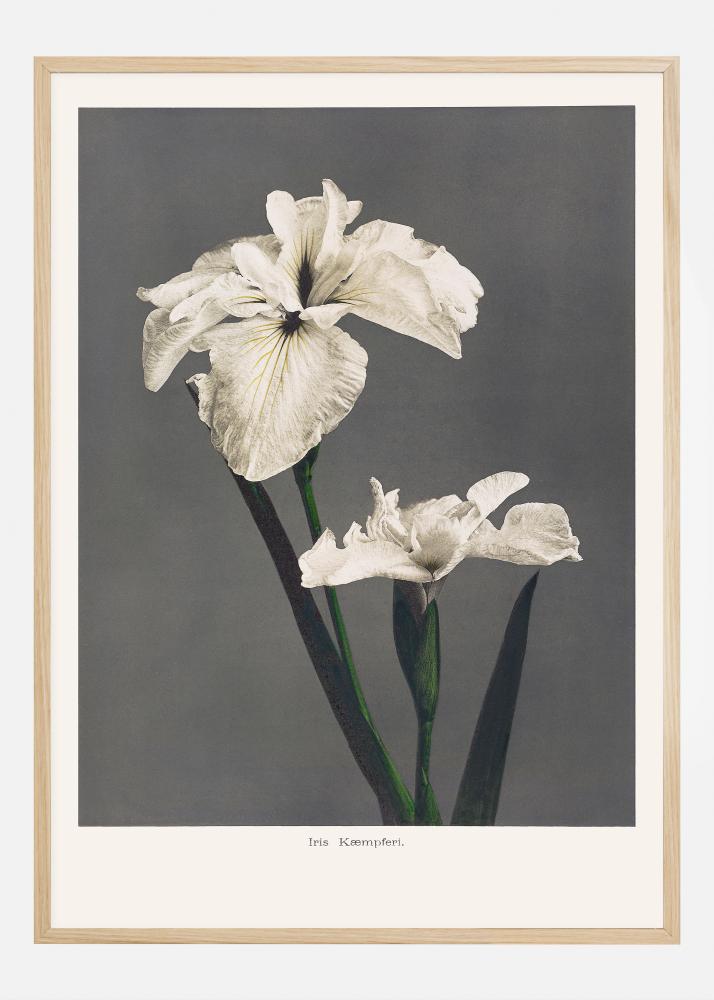 Този елегантен плакат представя Iris Kaempferi, известен също като японски ирис, в нюанси на избледняло злато и бяло срещу фин сив фон, който подчертава скулптурните качества на тези очарователни цветя. Детайлите в структурата на цветята са фино подчертани с сенки и светлина, които играят върху венчелистчетата, докато тъмни, почти черни линии в сърцето на цветето добавят дълбочина и измерение. Хармонично съчетание на цвят и форма, което пресъздава естествената красота на тези цветя.