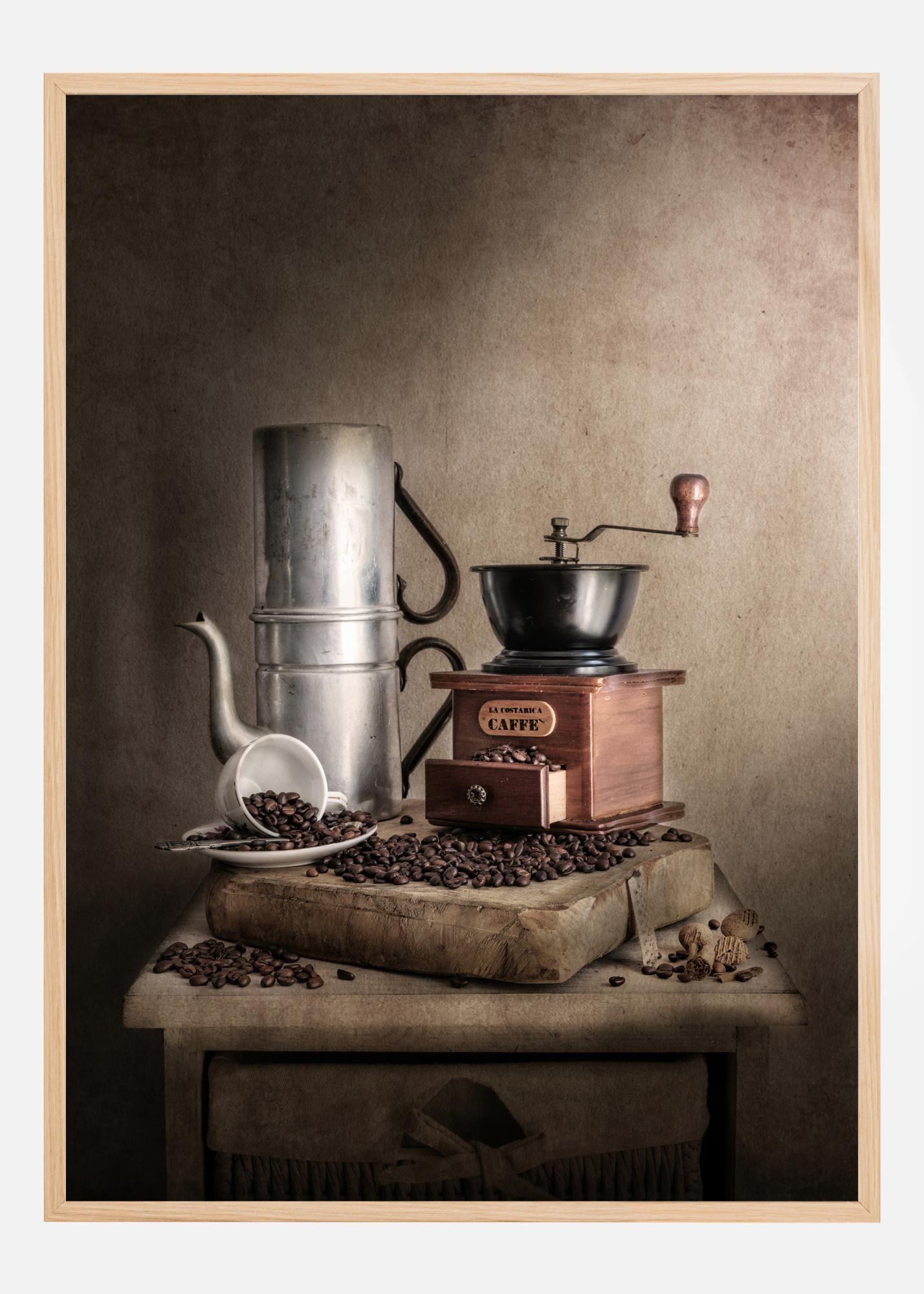 Плакат на кафе тема с кафемелачка, кафе каничка, кафени зърна, както и бяла чаша и чинийка. Меките кафяви тонове в тази щампа създават релаксираща картина, на която почти можете да усетите аромата на прекрасните печени кафени зърна. Перфектната картина за окачване в кухнята ви.
