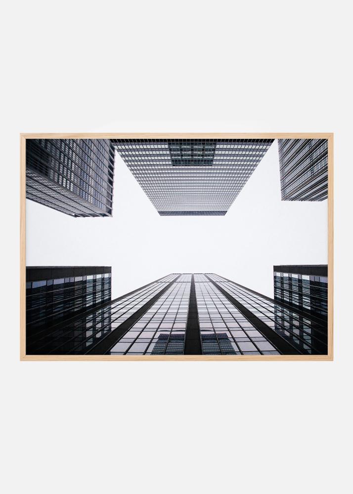Архитектурен постер с растящи небостъргачи срещу облачно бяло небе. Елегантна снимка на тъмни сгради на бял фон, с отражения на небето в стъклата. Перфектен подарък за този, който харесва графични портрети на сгради. Печатът изглежда добре в черна рамка, която подчертава тъмнината на изображението и става красив в комбинация с други фотографии на архитектура.