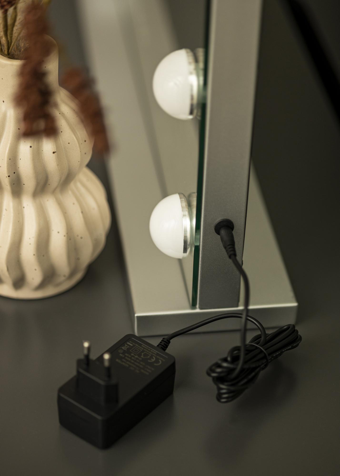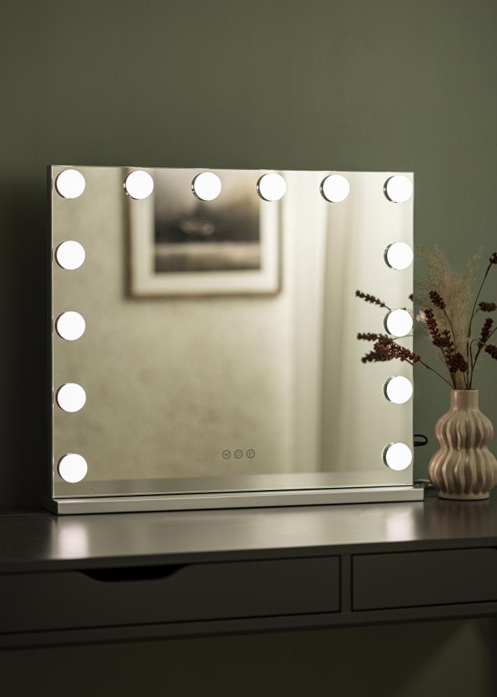 С това огледало за грим ще добавите повече блясък в дома си, благодарение на луксозния дизайн с 14 големи LED лампи, които създават рамка около огледалната повърхност. Сребристият нюанс и правоъгълната форма усилват стилния израз още повече. Огледалото може да бъде монтирано на стената или да бъде поставено като декорация на шкафове и странични маси. Огледалото се свързва с контакт.
