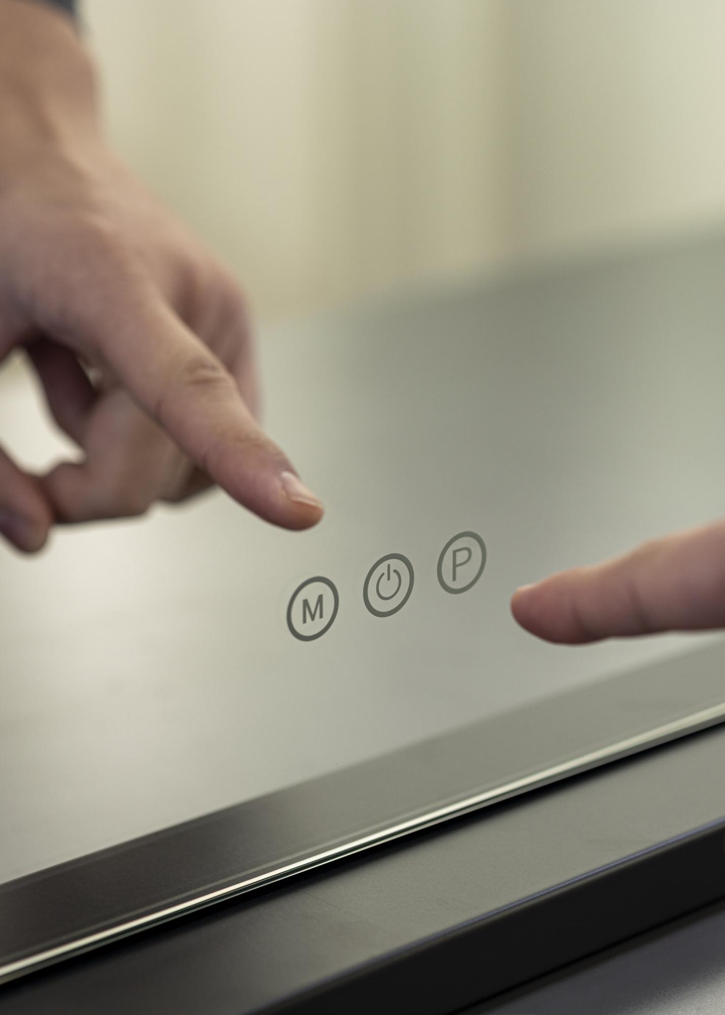 Осветлението на това огледало е димируемо и има цветна температура от 3000K-6000K. Можете лесно да настроите осветлението според предпочитанията си с помощта на сензорните бутони на огледалната повърхност. Задържайки бутона "P", можете да димирате светлината, а с помощта на бутона "M" можете да изберете дали искате топла, студена или естествена светлина. Също така има бутон за включване/изключване, който можете да използвате за стартиране или изключване на осветлението на огледалото.