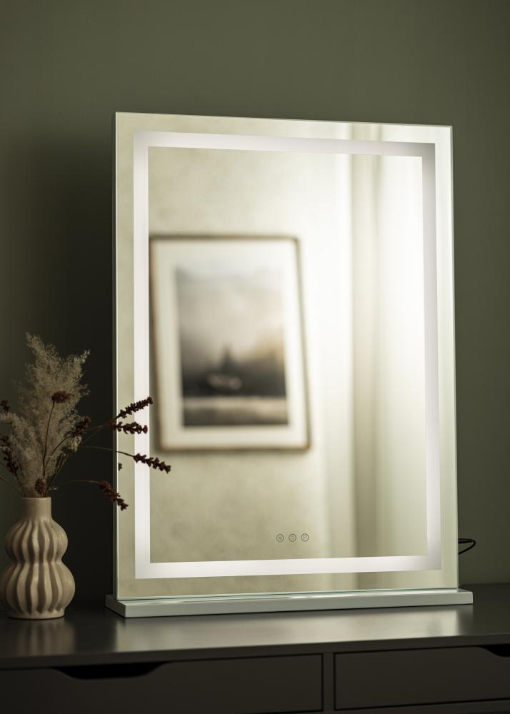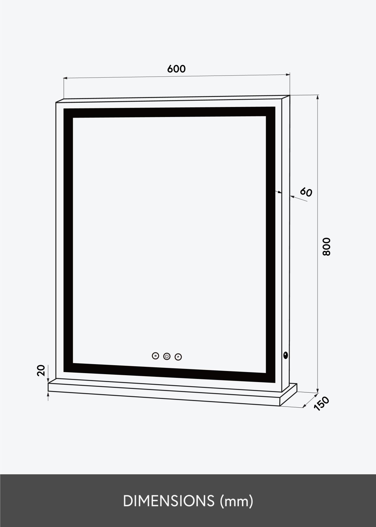 Това огледало за грим е перфектната комбинация от минимализъм и модерност. Има класическа форма и модерна LED-лента, която създава рамка около огледалната повърхност с размери 80x60 см. Огледалото има стойка, която може да се свали, така че да изберете дали искате огледалото да стои на маса или да виси на стената. Монтира се във вертикално положение.