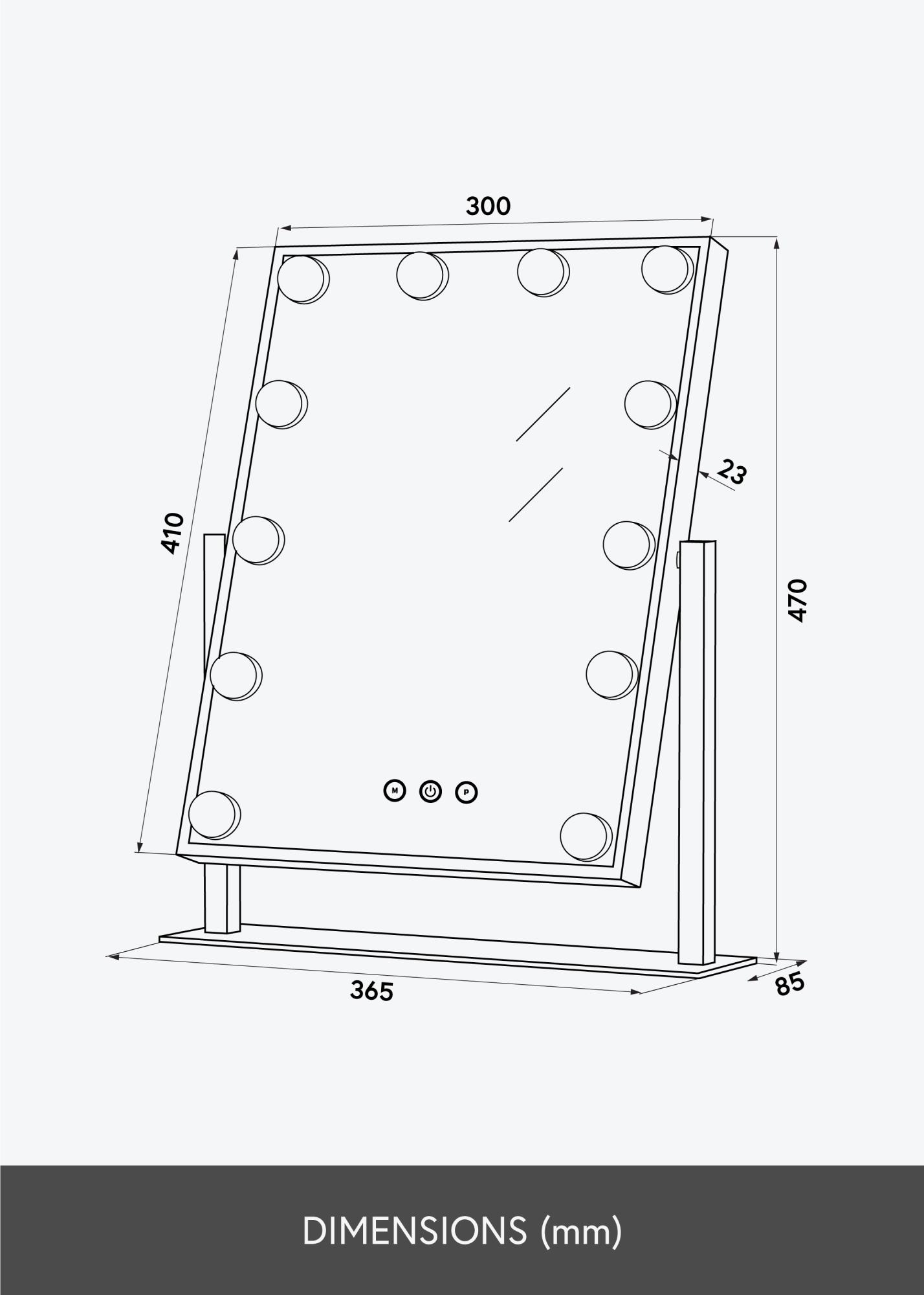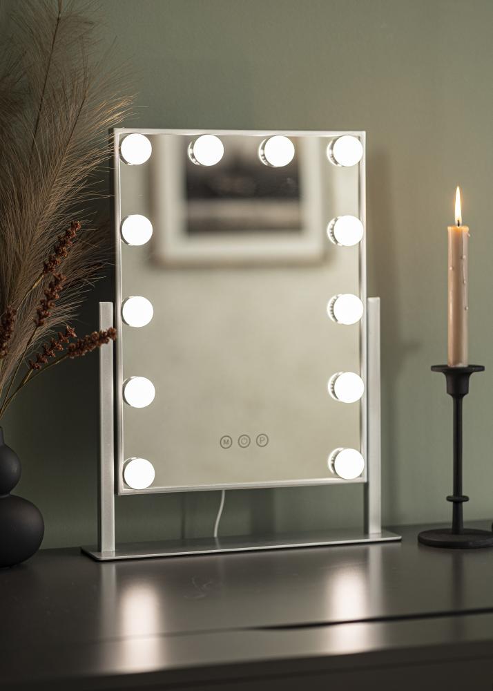 С луксозно огледало за грим с вградена осветление можете да се приготвяте за деня по по-удобен начин. Това сребристо огледало има осветление във формата на 12 LED лампи, които рамкират повърхността на огледалото, придавайки му вид на смес от елегантен минимализъм и холивудски блясък. Осветлението на огледалото е също така регулируемо, и можете да променяте цветната температура и да регулирате светлината както ви е удобно. Това правите с помощта на сензорни бутони на предната част на огледалото, където бутонът "М" настройва цветната температура, а бутонът "P" регулира яркостта. Също така можете да включвате и изключвате осветлението на огледалото с помощта на сензорен бутон.