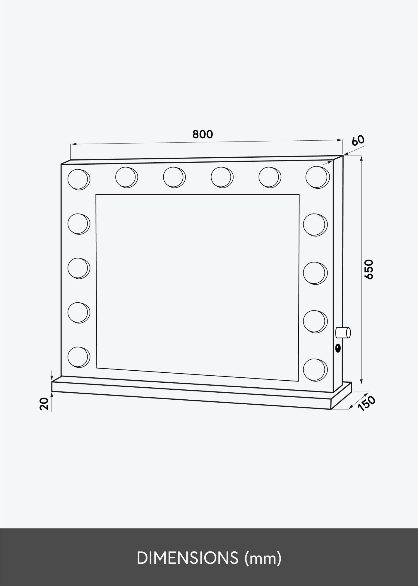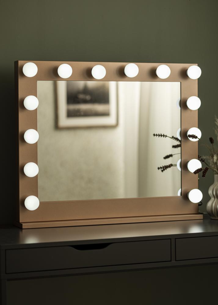 Това е огледало за грим с висока елегантност, благодарение на дизайна, вдъхновен от Холивуд, с широка рамка в нюанс на розово злато, украсена с 14 големи LED лампи. LED крушките имат гнездо E27 и могат лесно да бъдат заменени при нужда. LED като източник на светлина е също така устойчив и енергоспестяващ вариант. Огледалото излъчва студена бяла светлина, която може да се регулира с помощта на малко копче за завъртане на едната страна на огледалото.