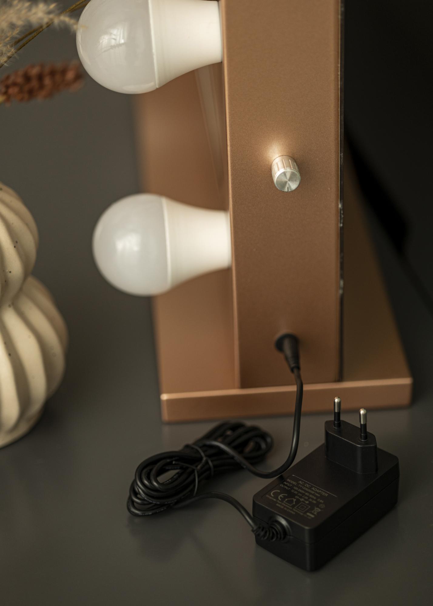 Рамката в розово злато се съчетава с основа в същия стилен нюанс, което прави това огледало перфектен декоративен елемент както на маси, така и на скринове. Ако предпочитате да закачите огледалото на стената с помощта на стенните държачи на гърба, можете да демонтирате основата. Електрическото свързване се извършва чрез щепсел.
